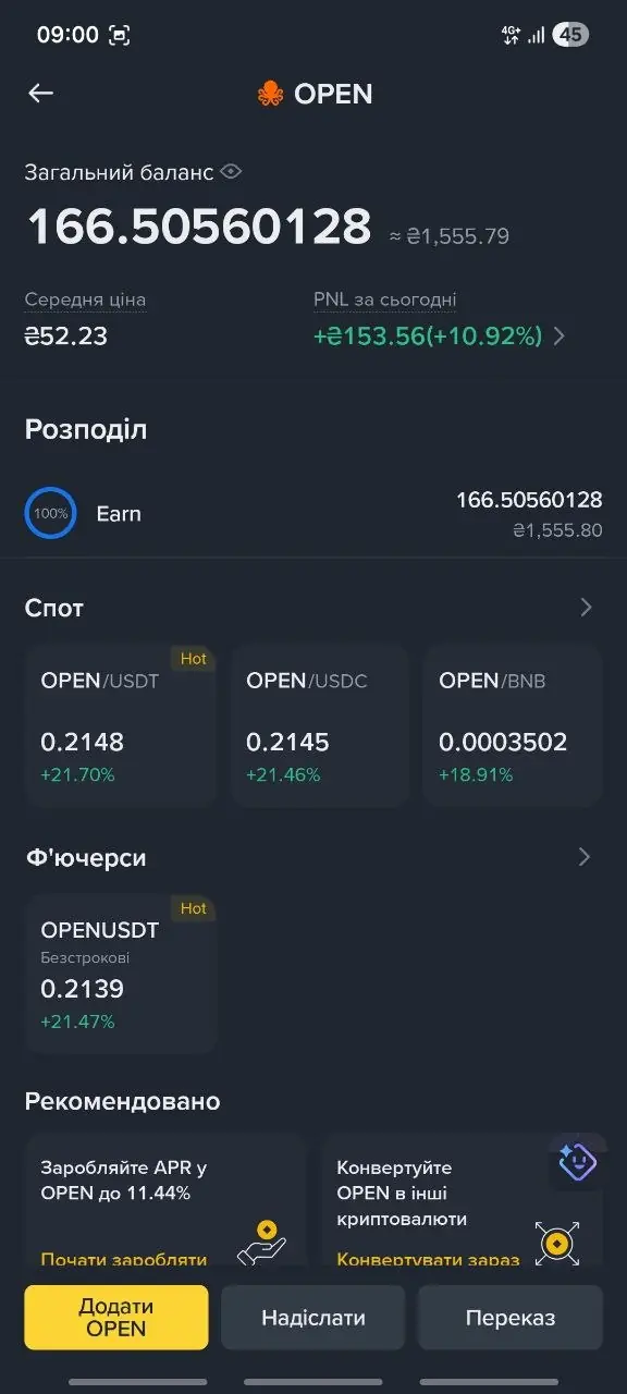 В подальшому я вирішив не виводити кошти, а на всі кошти, що були на рахунку а це близько 8300 гривень, купити свіжоспечений пиріг-нову монету, яка щойно з'явилася. Це була OPEN, і мною успішно як я думав тоді, було куплено близько 166 одиниць цієї монетки.