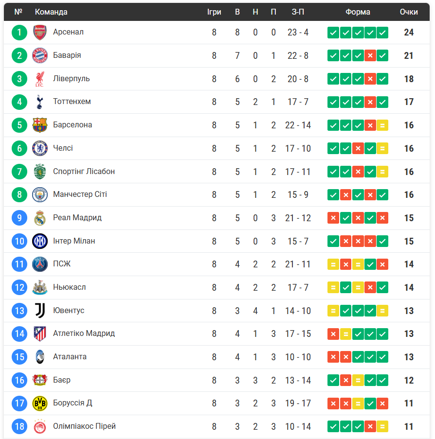 До 1/8 фіналу Ліги чемпіонів вийшли 8 команд: Арсенал (24 очки) Баварія (21) Ліверпуль (18) Тоттенхем (17) Барселона, Челсі, Спортинг, Ман Сіті (по 16)