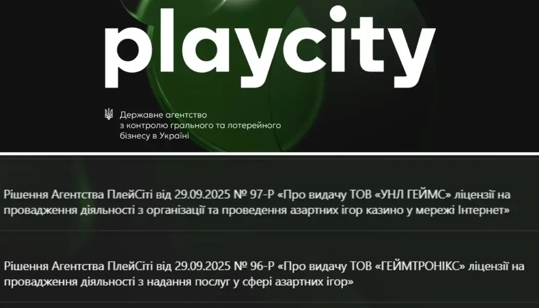 Національне агентство з питань регулювання азартних ігор і лотерей «ПлейСіті», яке було створено замість КРАІЛ у березні цього року, нарешті почало видавати перші дозволи на організацію азартних ігор. Відповідні рішення з'явились на офіційному сайті регулятора. Згідно з цими документами, нові дозволи отримали дві юридичні особи: ТОВ «УНЛ ГЕЙМС» та ТОВ «ГЕЙМТРОНІКС».