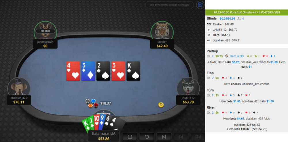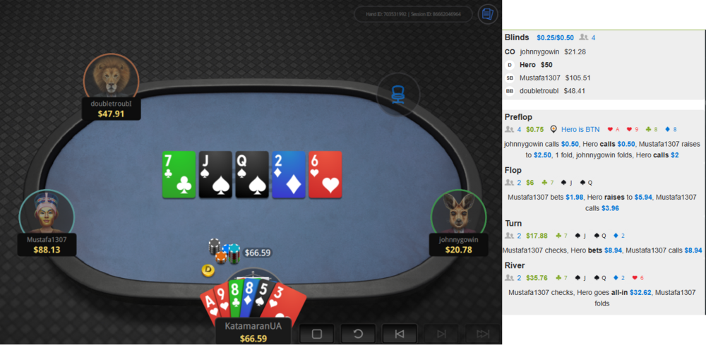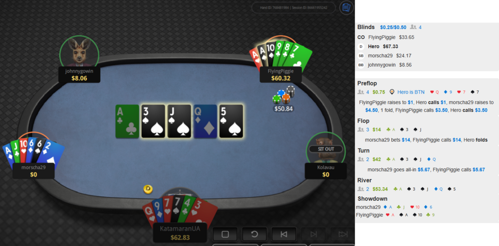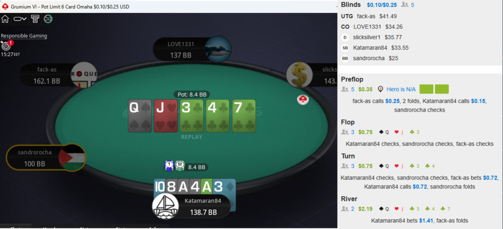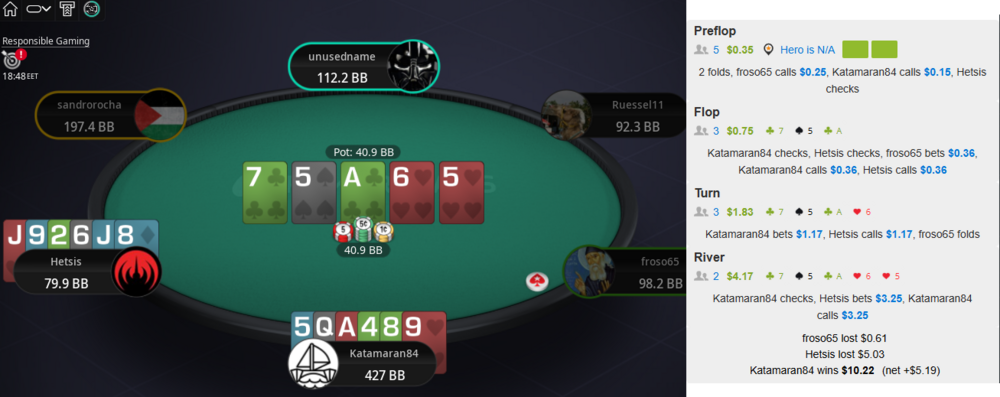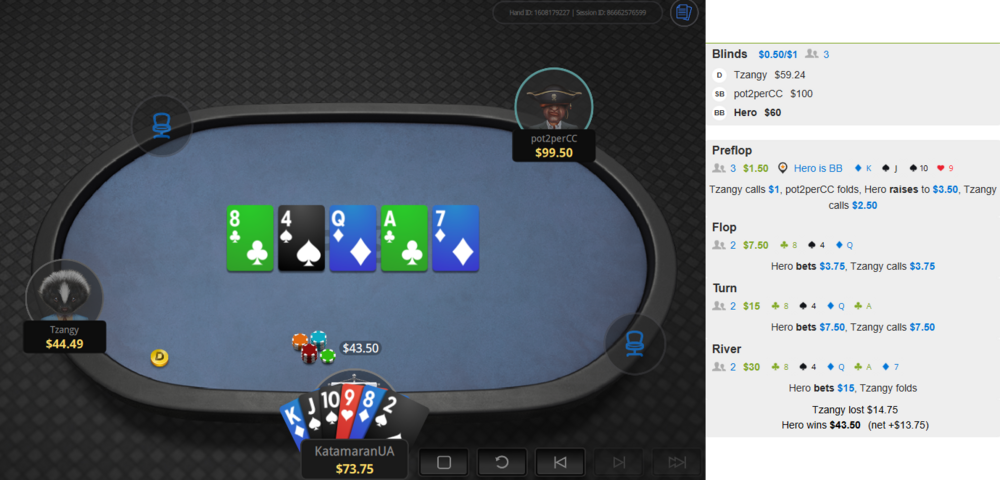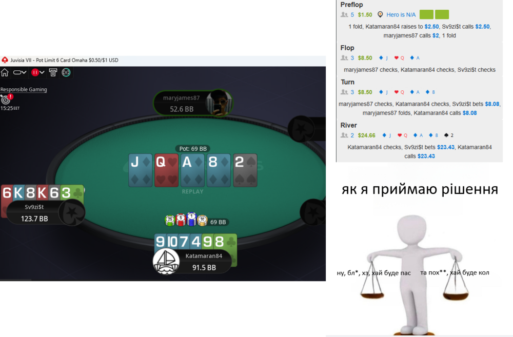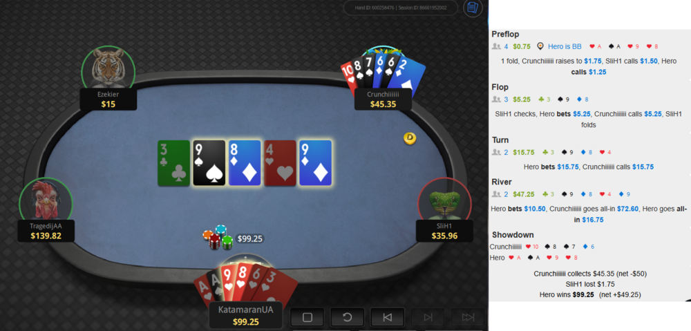 тут у мене і без ТТ в руці доволі непогана з перспективою на гарний рівер і неочікуваний топфул (або ж жахливий аут на нього ж, бо оп скинувши показав 99). але після чеків флопа і дивної ставки тьорном в 1бб можна заімітувати стріт.