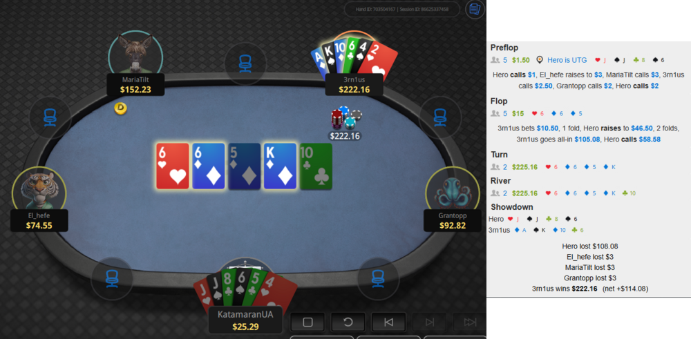 даю рейз, яким відповідаю, шо зрозумів його і це добре, але в мене вона теж є. і майже точно ще й 5 до неї. поїхали, але 50% в тебе тут можливо і не буде (самий низ мого діапазона тут 55****. з просто 6 і оверами я б у позі скоріше дав кол глянути тьорн, хоча з 4-5 оверами вже був би рейз).