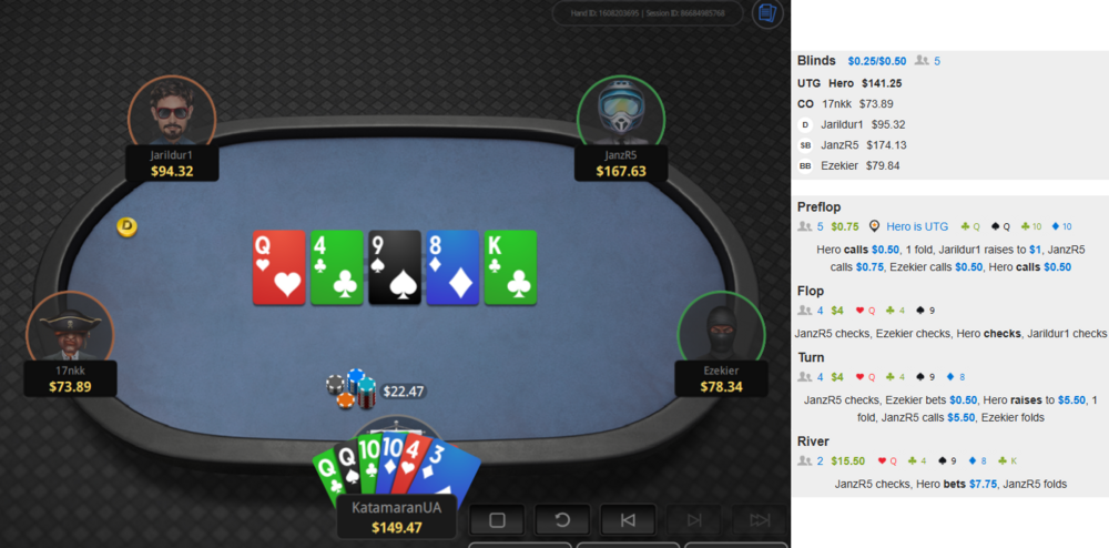 по конкретній роздачі: важче приймати рішення, аби він поставив три барелі. але після чеку в позі флопа розпочата вистава для мене вже викликала менше довіри. до всього ще й у самого купа блокерів на бубни.