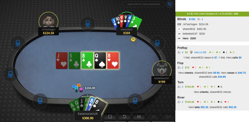 по роздачі: тьорн виліз не дуже приємний. та чек давав не тому, шо стало страшно, а аби якраз таки дати хлопу бетнути шось і відповідно зарядити на всі. бо у таких опів чого тільки не побачиш на шд. 9Т, звісно, там теж є, але там і повно всякого мотлоху, який він не скине на мій рейз флопа і захоче поставити в чек, яким я показав слабкість.