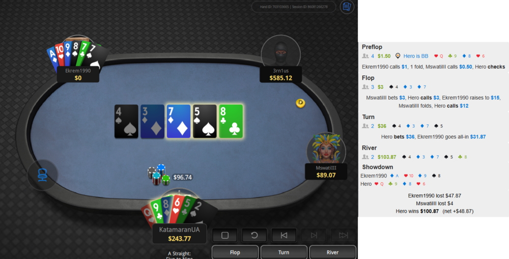 2. просто тирив блайнд. але ми з ним грали на кількох столах і вже пару стеків на 50 в нього встиг віджати. напевно злився (фіолетовим маркером помічаю адекватів і він шось нехарактерне тут видав), а тому на рівері влаштував в'єтнам. я не проти. з натсами ізікол.