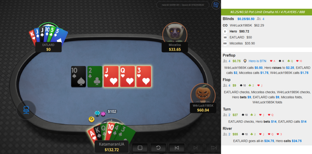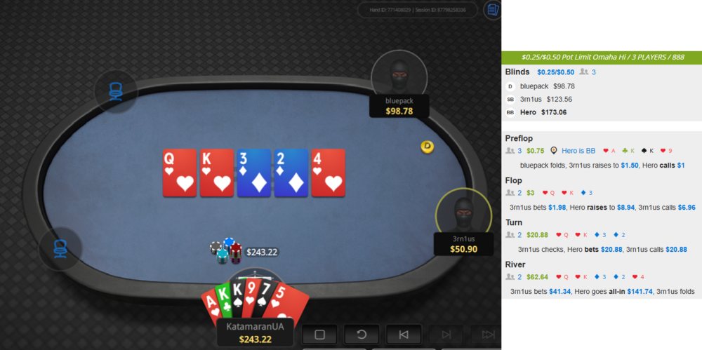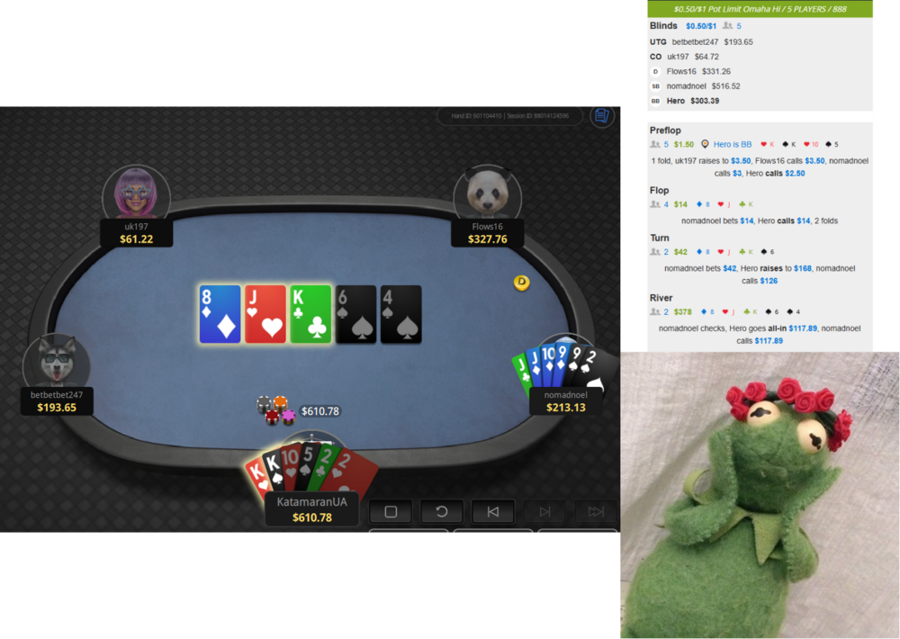 цілком вірю, шо у нього там були JТ♥️ і він не чудив, але шо я тут пушить то можу, крім Ах-флеша? хіба шо голий А♥️, бо загалом я то знаю, шо він з тих, хто скоріше зариє, бо тут не так, шоб пару баксів докинути, а цілий стек... ну це все теоретичні роздуми, бо коли в руках натс, то багато думати не треба. він вирішив не перевіряти є в мене шось до туза чи нема.