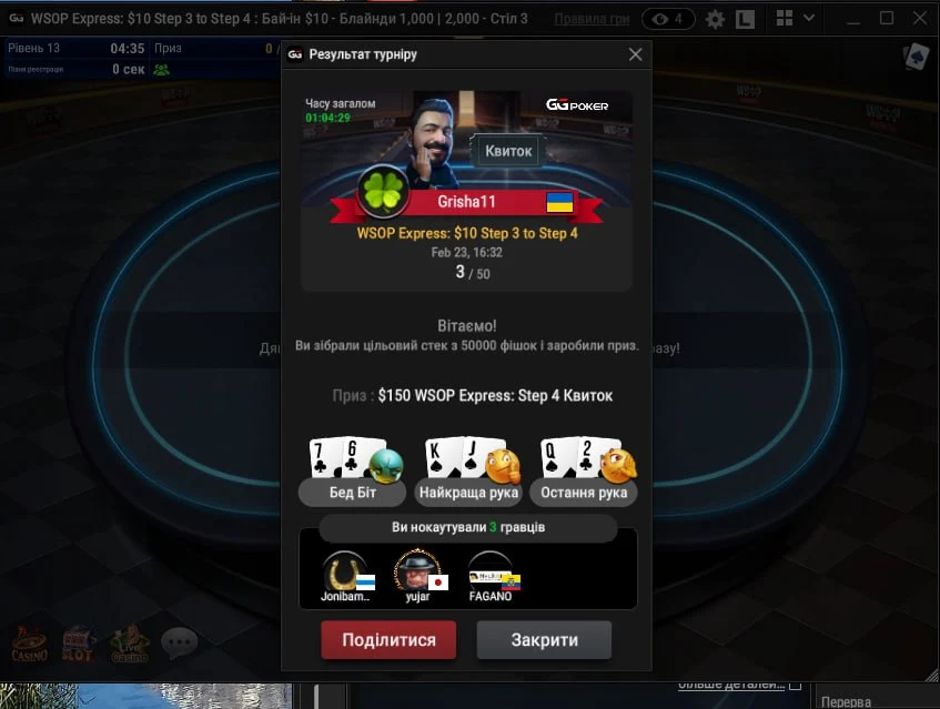 Кубка Я не виграв.На фінальному столі побував.Зробив один нок в розмірі 1 к.грн.що приємно.Коли в турнірі залишалось 40 гравців був в самому низу таблиці і стек становив 2-3 бб.