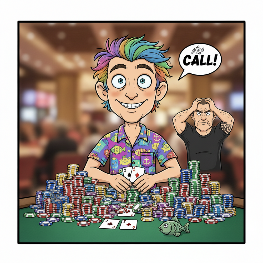Ми його називаємо «Риба», але він, по суті, дитина, керована емоціями. Він грає надто багато рук (лузовий) і платить, платить, платить (пасивний/слабкий), бо сподівається, що карта прийде. У його грі немає логіки чи структури.