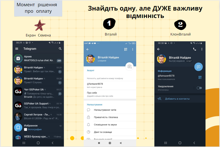 У пів-першого ночі йому в приватний тг пише один із онлайн-знайомих по вказаному чату. З яким було до цього, скажімо, півроку спілкування онлайн, і були навіть взаємні переводи по депу/кешауту. Тобто – приятель «з історією». «Віталій, а що відбувається? То переводити 3800 чи не переводити?» Віталій, який «ні сном, ні духом» - каже «Стоп» і починає «в'їжджати». Картина прояснюється. Приятель по спілкуванню – назвемо його Слава – пізно ввечері кинув у чат жалібне «Я так залився в сесії, що жах. Що робити?» Зрозуміло, що питання нібо то риторичне. Хтось лайнкув, хтось пожалів. Але знайшовся той, хто визвався реально допомогти. Назвемо його «КлонВіталія». Так от Слава отримує таке повідомлення «Як ти знаєш, я і модератор чату, і маю прямі зв'язки з сапортом руму. Я кинув запит – там підтвердили, що ти сьогодні програв багато за одну сесію. Коротше, якщо швидко приймеш рішення – то для тебе є персональна пропозиція по депу, як для нашого чатланина. Ти робиш депозит через мене 100, і по цьому депозиту, прив'язаному до мого запиту щодо тебе, тобі нараховують ще +100% до депу турнірними доларами, і + квиток за 210. Тобто зі 100 – 410, якщо зараз і якщо через мене. Рішай швидко, поки не змінився оператор в сапорті». Слава розуміє, що пропозиція супер. Депати все одно прийдеться. Не сьогодні – то завтра. Бо хочеться грати і треба відігруватись. Пропозиція солодка, майже відбиває «залив». Контакт надійний – модератор чату, 100 раз чулись/бачились. І Слава набирає в приватний тг Віталія, щоб переводити гривні, отримати номер карти. І в момент відправки бачить на екрані, що Віталіїв у нього два поряд. І обидва – модератори.