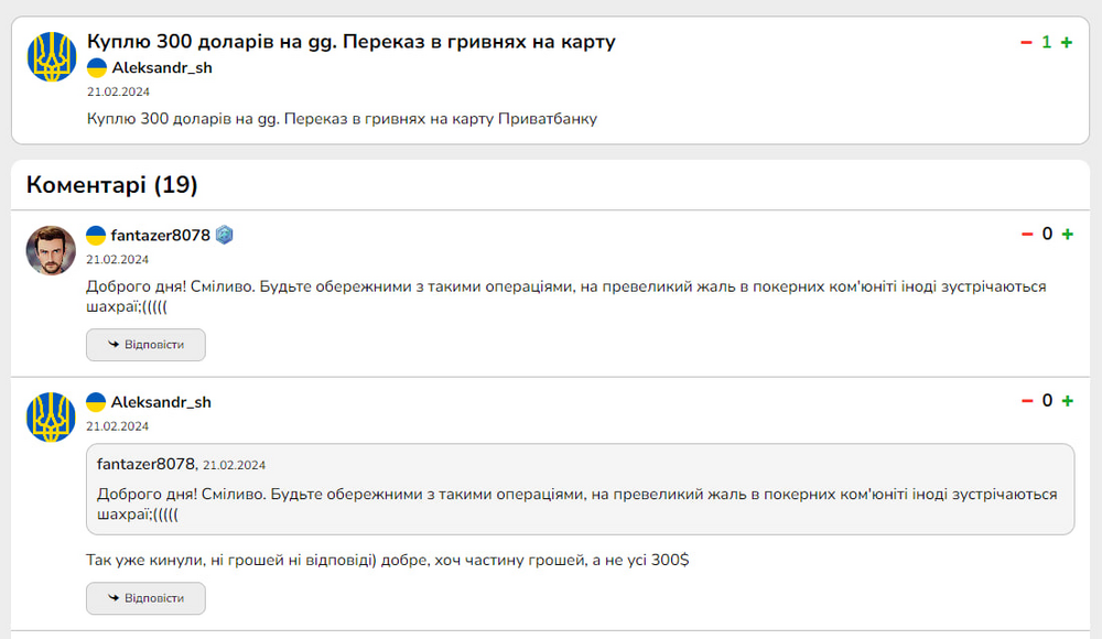 Удави моніторять сайти і чати на предмет саме таких оголошень. Бо ні один гравець, який має за спиною хоча б 50-100 депів/кешаутів за своє покерне життя, так не вчинить. Це оголошення «зеленого» гравця. Початківця, який ще не знає «законів жанру». Тобто, повністю готовий до «кидка», навіть трудитись не треба. Треба просто встигнути відгукнутись першим і запропонувати: «Так, я саме збирався виводити. Тому давай не по 37 і не по 42, а по 39. І не 300, а давай спочатку 100, або в три заходи. Так всім буде спокійніше». Все, кришка закрилась, про тебе турбуються більше, ніж найближча людина. Хотіли б кинути – забрали б 300. Ні. Їм достатньо 100. Це чудовий заробіток за 10хв і сорок букв в месенджері. Ви скажете, що так ніхто реальний не пише? Ось скрін з нашого форуму пів-місячної давнини