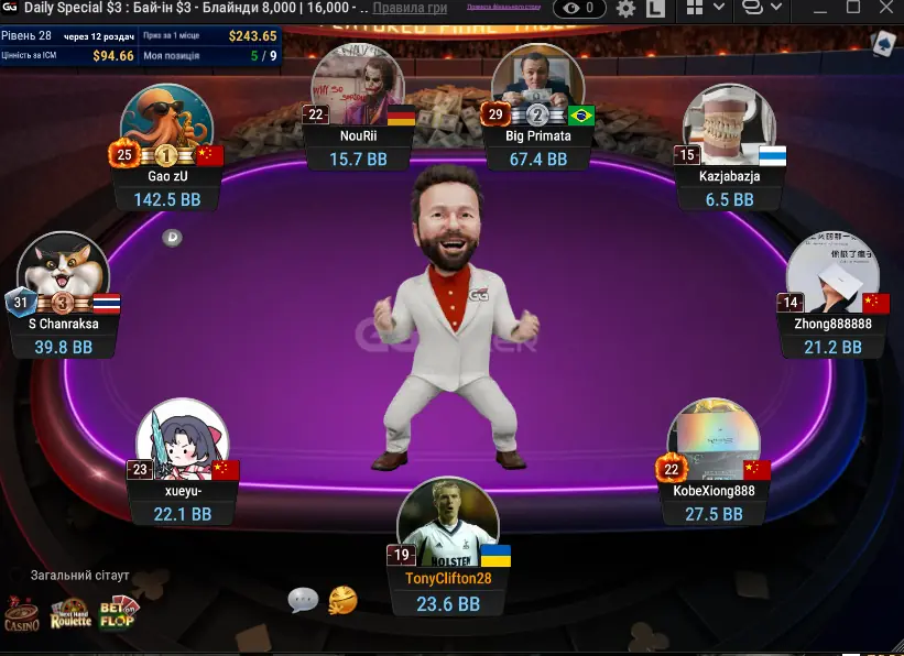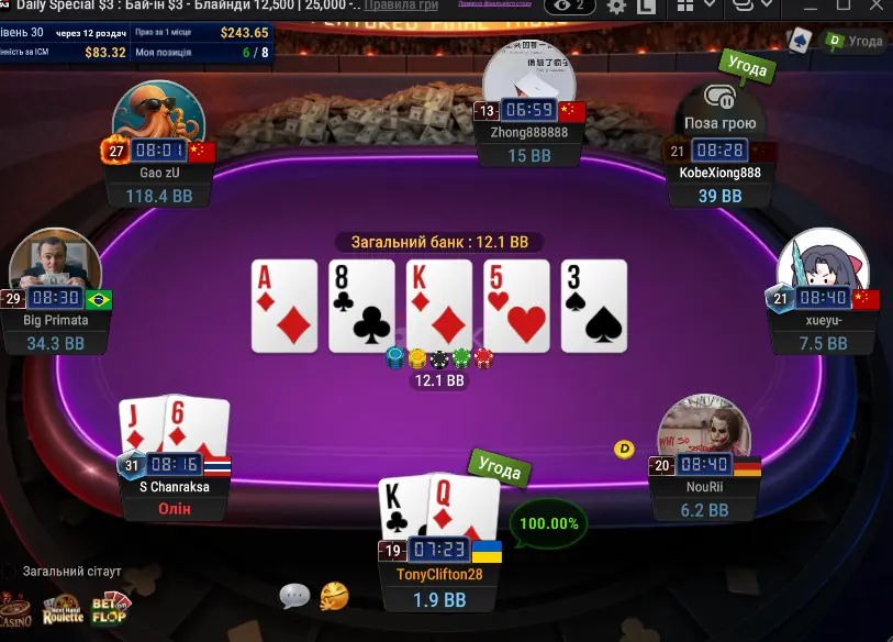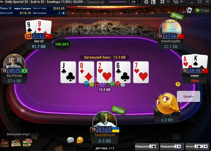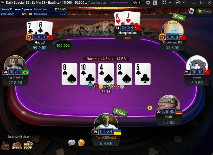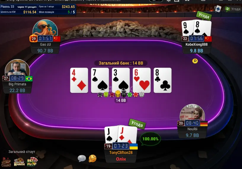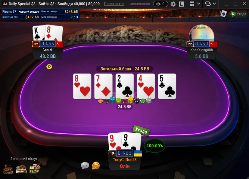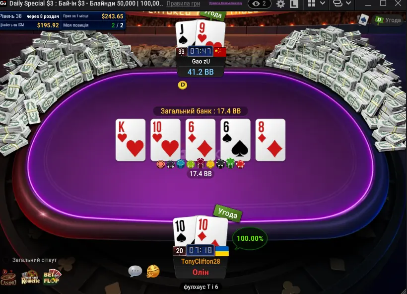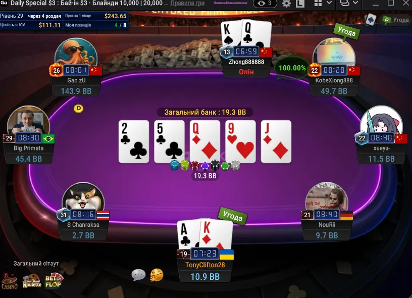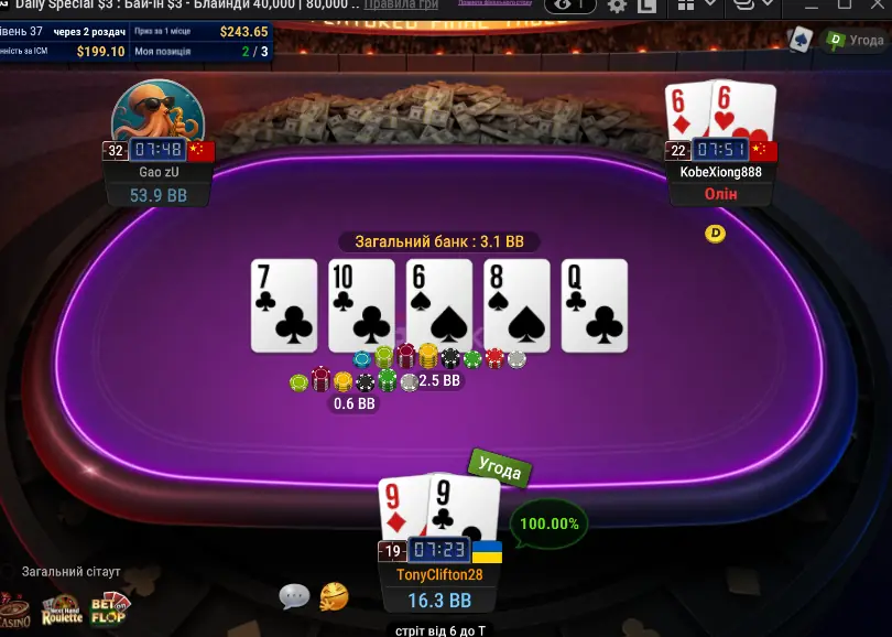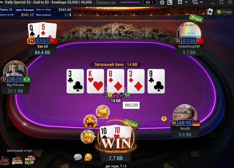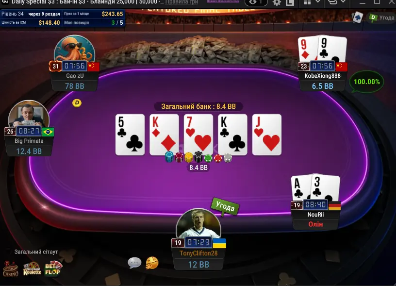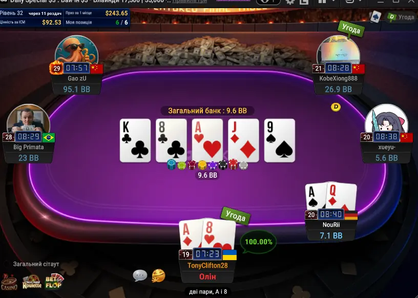 Сесія підходила до кінця, залишився один турнір в якому було 5 блайндів, я вже дивився ютуб і чекав карту щоб виставитись і піти спати, неочікувано вдалось потроїтись.