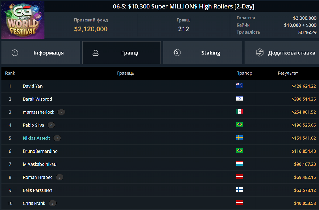 В топовій покерній мережі GGPoker завершився турнір Super Million$ вартістю в 10 300$. Крайній Супер Мільйон проходив в рамках серії GGPoker World Festival й мав цього разу вдвічі більшу гарантію ніж зазвичай, у розмірі 2 000 000$.