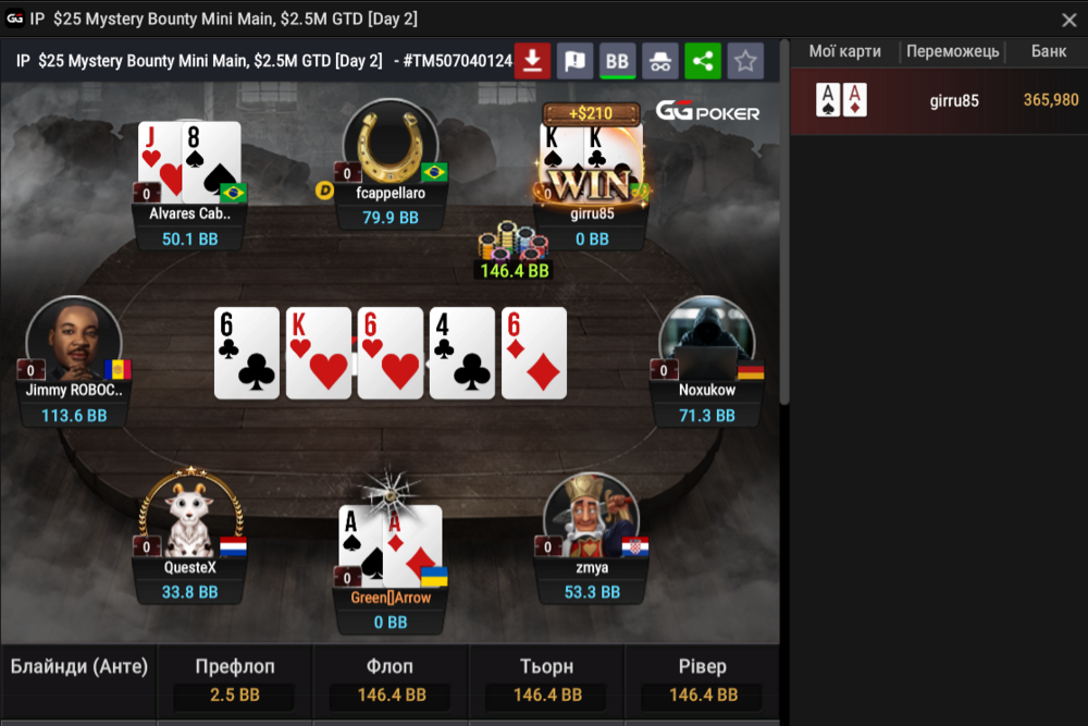 Тут трохи отримав фішок, хоч мій аллін і не вколили, але це дозволило пролізти в топ 30 майже з останнім стеком! І тут почалися вони - Містері баунті!😜