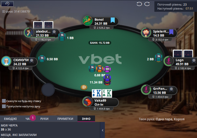 І ось одна з вирішальних, я на ВВ в мене 7бб і пара 77 на руках, я вирішив що це знамення)😅 і щиро впушив на лімп від всього столу, і отримав 5 колів здається , але з флопа 7 , яка дозволила отримати шалений банк! 🤑 (нажаль цю роздачу не вдалося зберегти, через розформований стіл Vbet)🤷
