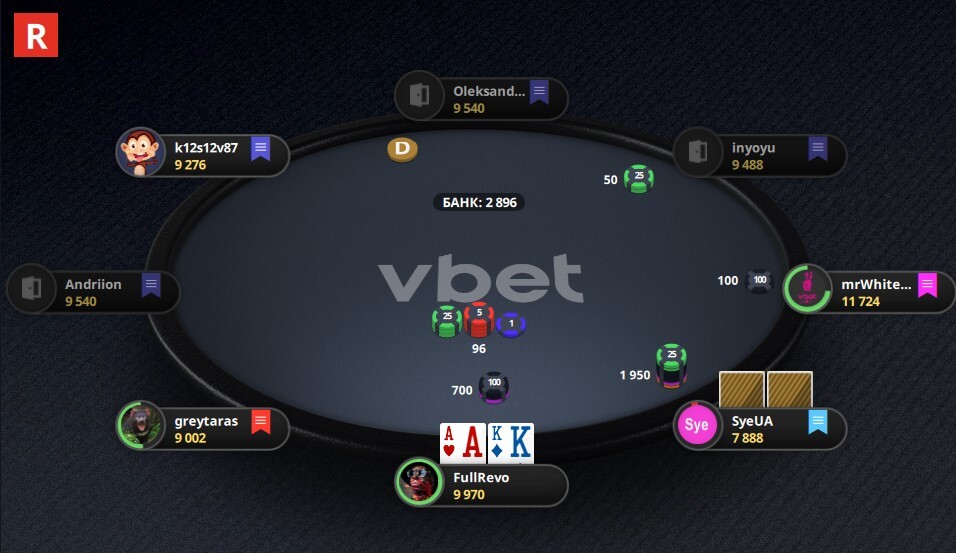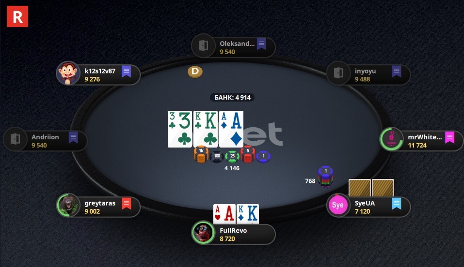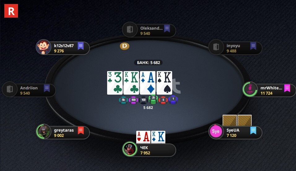 На тьорні виходить король, а мій опонент чекає. У мене другий натс, а значить я майже завжди попереду. На його чек я вирішую слоуплеїти, бо якщо Sye здається, то є невеликий шанс, що він або ризикне блефанути на рівері, або значно ширше проколить мій вельюбет. Також я сумніваюсь, що у мене тут є ще дві вулиці велью з Ах рук, а тому моє рішення мені подобається.