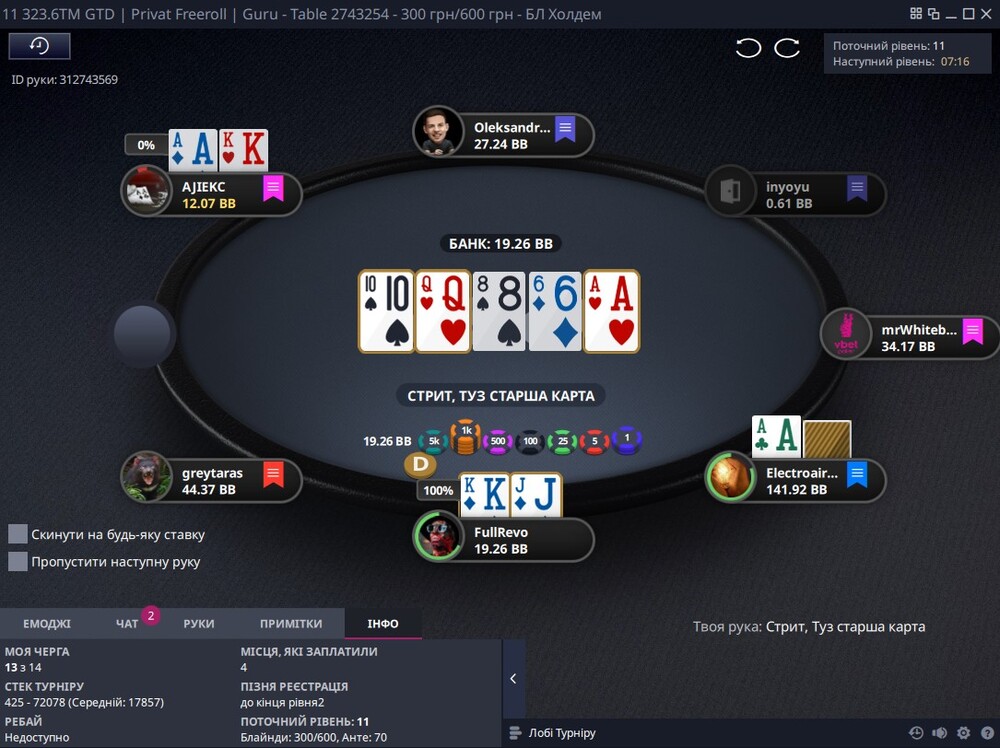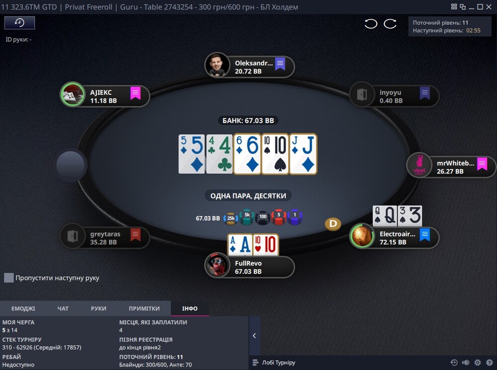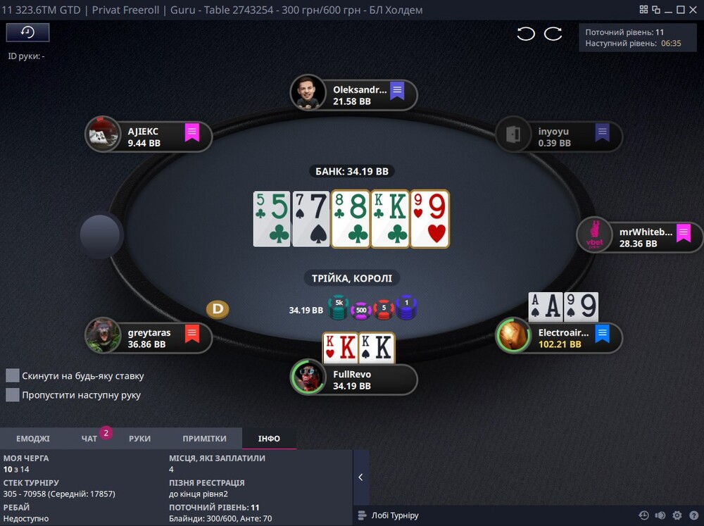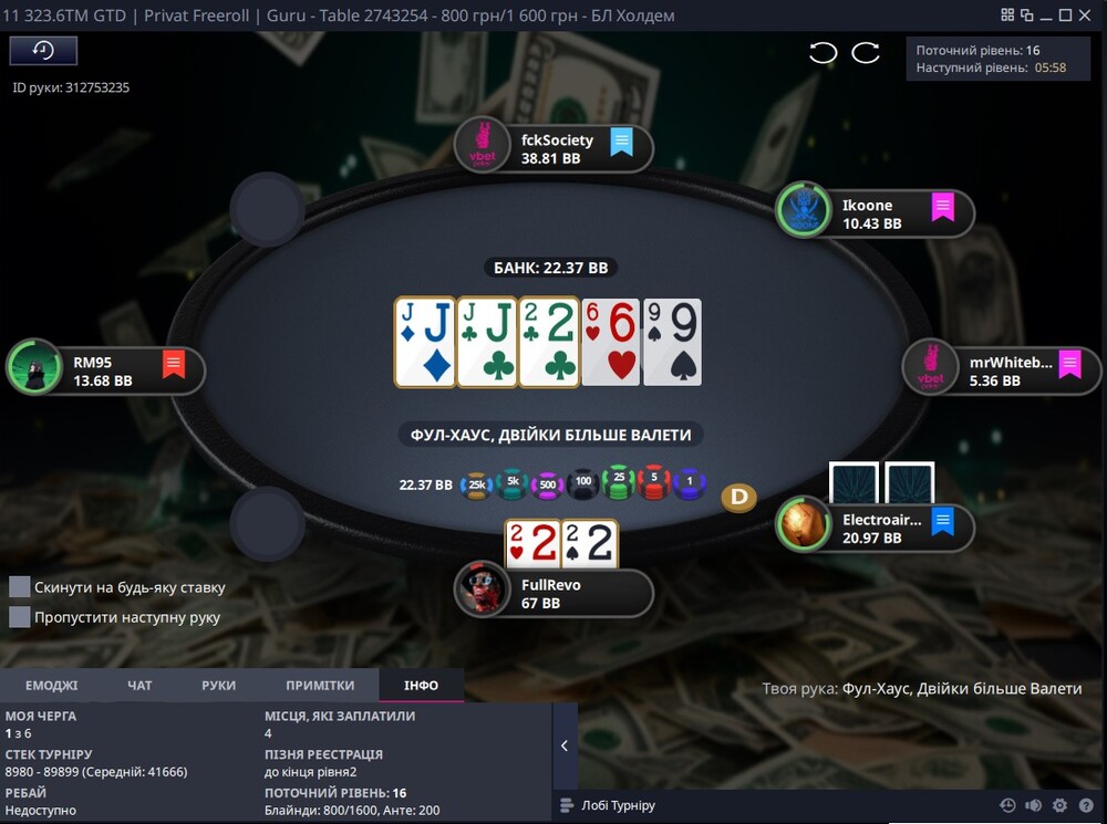 І ось за наш стіл підсідає Electroairman, який зі стеком 142bb впевнено утримує лідерство в турнірі та є одним з головних претендентів на перемогу в лідерборді.