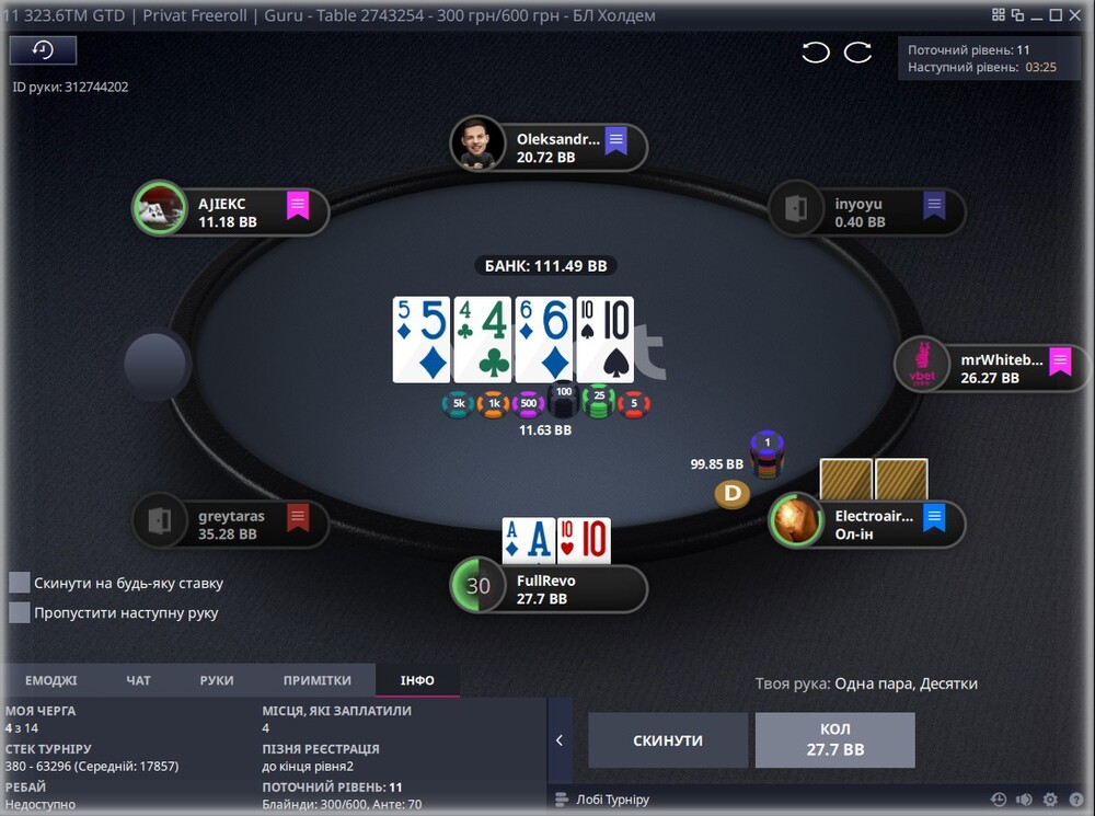 А далі трапилась ситуація, яка, на мою думку, стала визначальною в цьому протистоянні. Через те, що у мене вже був непоганий стек і я піднявся на поточне 4 місце мені здалось, що варто зіграти обережніше, а тому на його рейз з BTN граю просто колом на SB.