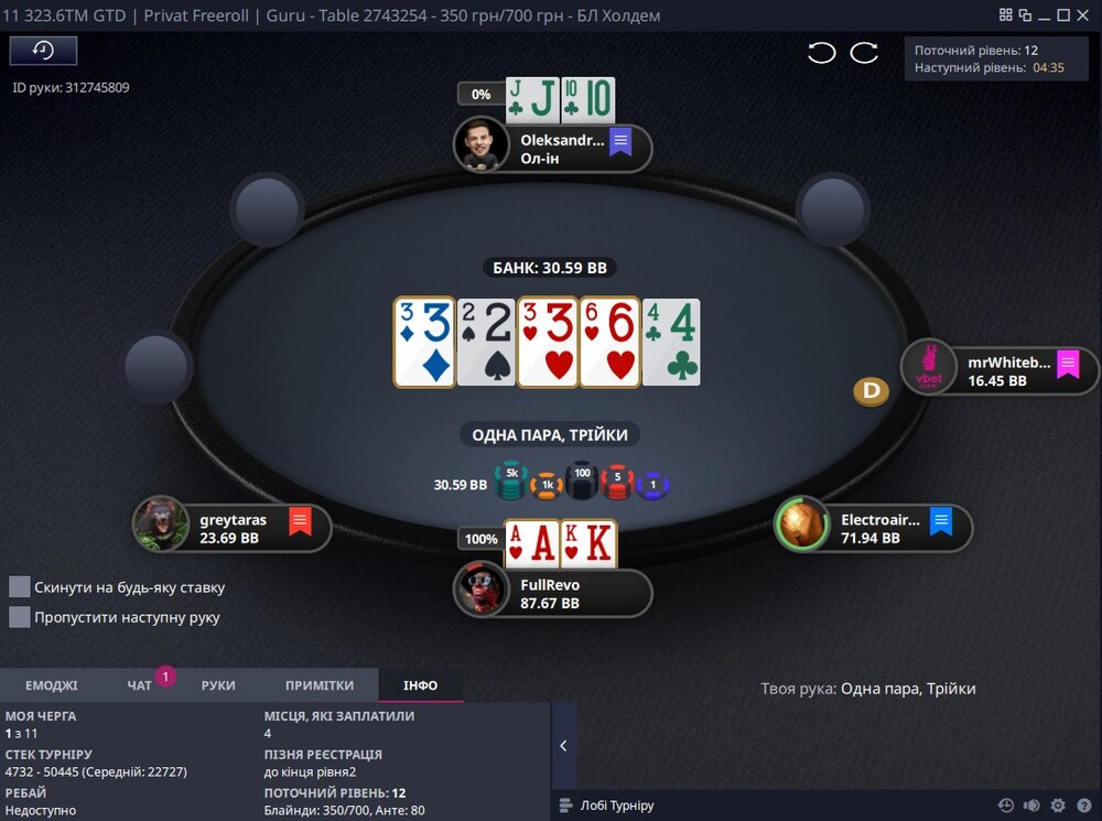 Після цього психологічна та ігрова перевага перейшла до мене. До того ж хтось з верховних покерних богів, у якості нагороди, вирішив мені увімкнути режим «SuperUser`a» на повну, а тому вже я перейшов у наступ, а Elecroairman навпаки – почав грати від захисту.