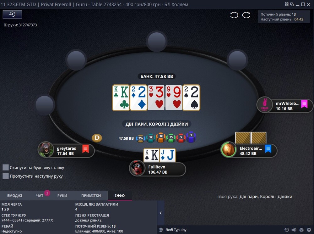 Тож провівши такий аналіз я впевнено натискаю "call", перемагаю і отримую стек 67bb.