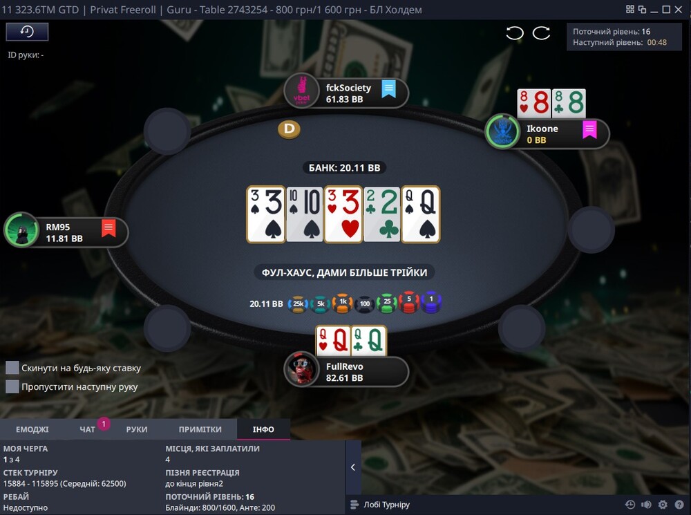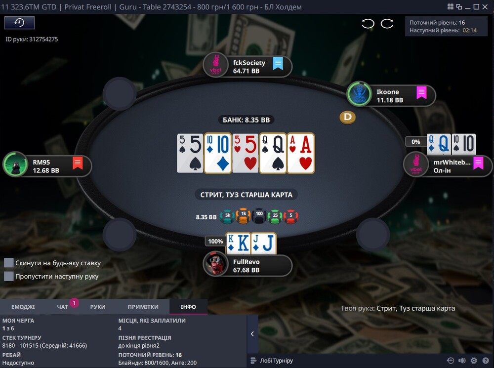 Після вдалого старту на мене чекав доволі затяжний період невдач під час якого фішки я лише програвав. Все дійшло до того, що на момент коли у грі залишилось 14 гравців я зі стеком 9bb займав 13-те місце з 14-ти.