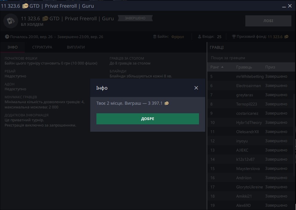 У підсумковій таблиці переможець Vetkos1980 набрав фантастичні 52 бали. У мене ж за підсумками змагань – 41. Двічі я виходив у heads-up будучи чіплідером з доволі суттєвою перевагою над опонентами, але обидва рази програв. Якби я зіграв трохи краще або фортуна не відверталась у вирішальний момент, то дві потенційні перемоги могли принести мені ще додаткових 8 балів, чого, як ми розуміємо, все ще не вистачає для перемоги, бо 49 менше за 52. Проте був ще один турнір у якому я міг набрати значно більше очок, однак вилетів на баблі.