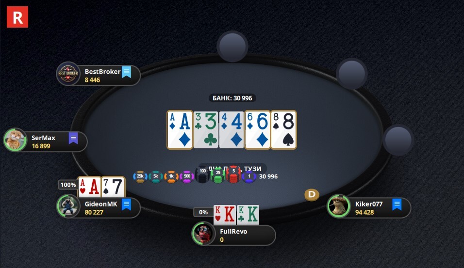 По флопу я граю чек/кол на його невеличку ставку, а на тьорні, отримавши ТПТК, вирішую зіграти чек/пуш… Але опонент пушить сам чим збиває мене з пантелику, оскільки це означає, що у нього або блеф, або супер велью..
