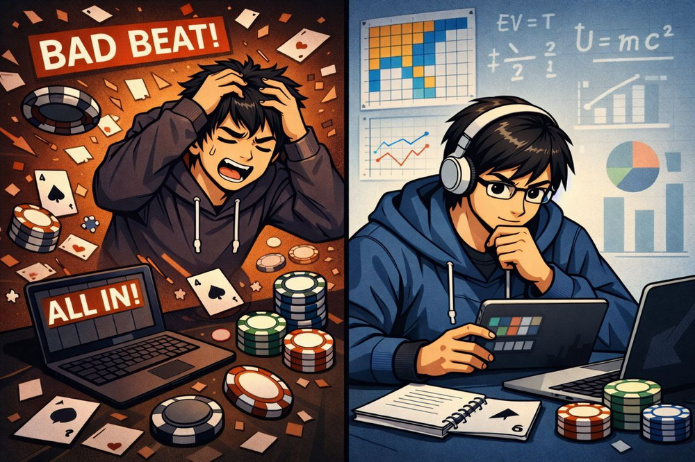 Це один із найбільш недооцінених моментів, дуже важливо визначитись з тим, яка твоя роль у покері. Часто люди самі не розуміють мету свого навчання і який взагалі план? Заробляти покером не дорівнює бути професіоналом, заробляти можна і в якості хоббі. А от зробити покер своєю основною діяльністю і основним джерелом доходу - це зовсім інший рівень відповідальності, саме це я і вважаю "професійним" підходом. Бо, якщо ваша мета стати професійним покерним гравцем, це один шлях (часто через школи/фонди), а коли мета просто прогресувати як гравець тому, що ви любите цю гру і вам подобається розвиватися в ній - це інше. Я обрав друге, і відповідно до цього будував плани і очікування. Коли я почав ставитися до навчання як до процесу з: аналізом, структурою, планом розвитку, і найголовніше - без завищених очікувань, результати змінилися значно швидше, ніж після вивчення теорії.
