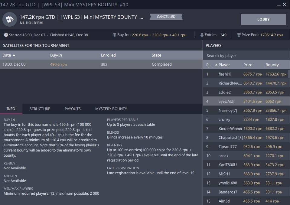 Оскільки практично не грав, але в хомках восени були попадання в призи, на моєму рахунку накопичилося ТМок, які я використовую для входів в турніри. В п'ятницю зайняв 12 місце в Mini Elite, в суботу — 9 місце в Mini Master, а в неділю вистрілив з третього входу до 4 місця в турнірі Mini Mystery Bounty. Ось так з 3 тисяч TM вийшло 14 тисяч гривень.