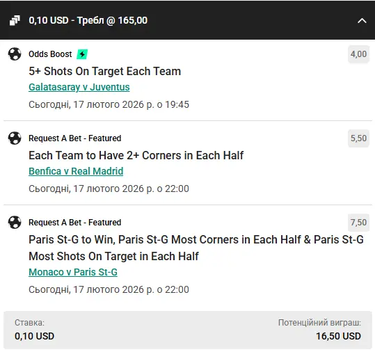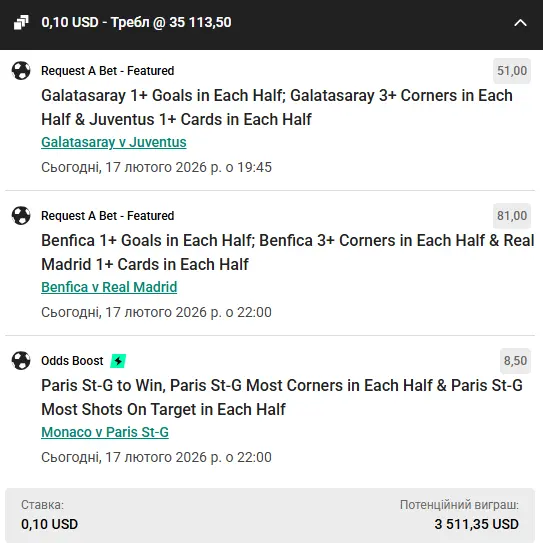 Удачі ! цікаві ставки, ПСЖ мабуть залетить, Галатасарай теж подобається) а от що там буде у Бенфіки ніхто того не знає, але віримо