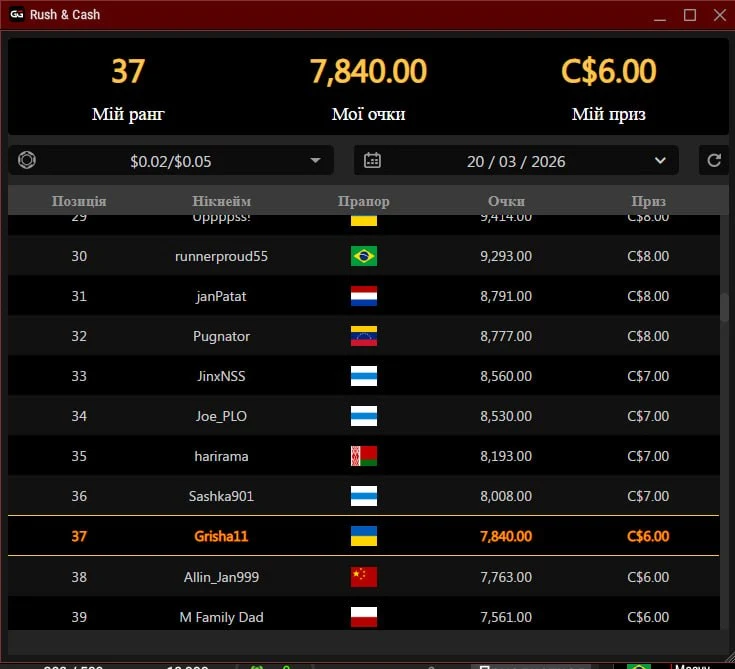 Ті хто катають Rush&Cash на лідерборд грають за такою схемою: Один день грають 4 столи по 16-18 годин, на другий день відпочивають) В основному грають в мінус, або в нуль)