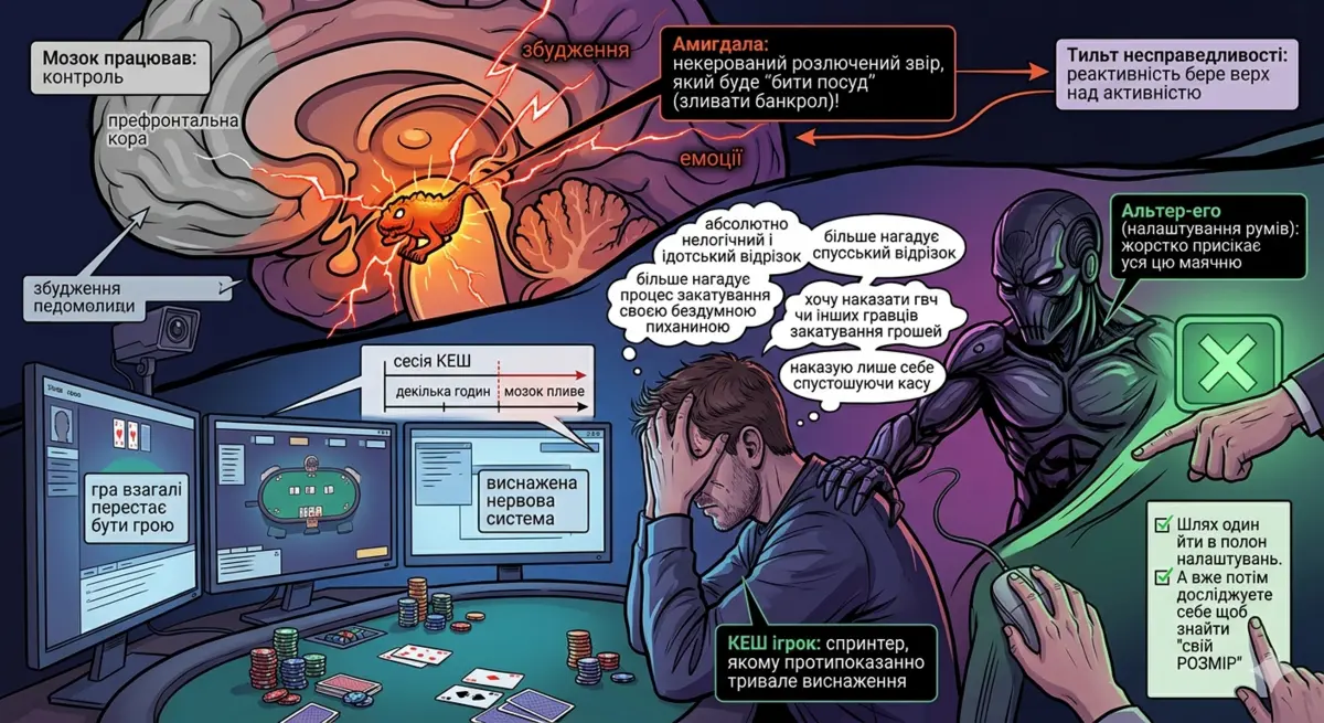Також слід враховувати, що сесії в яких багато негативних або позитивних емоцій, тиску, єкшену слід скорочувати, ці гравці можуть почати гірше грати навіть під тиском емоцій виграних роздач. Добре б себе знати якщо я пару роздач затягнув, або навпаки програв чи потрібна мені пауза? Якщо так, то скільки?