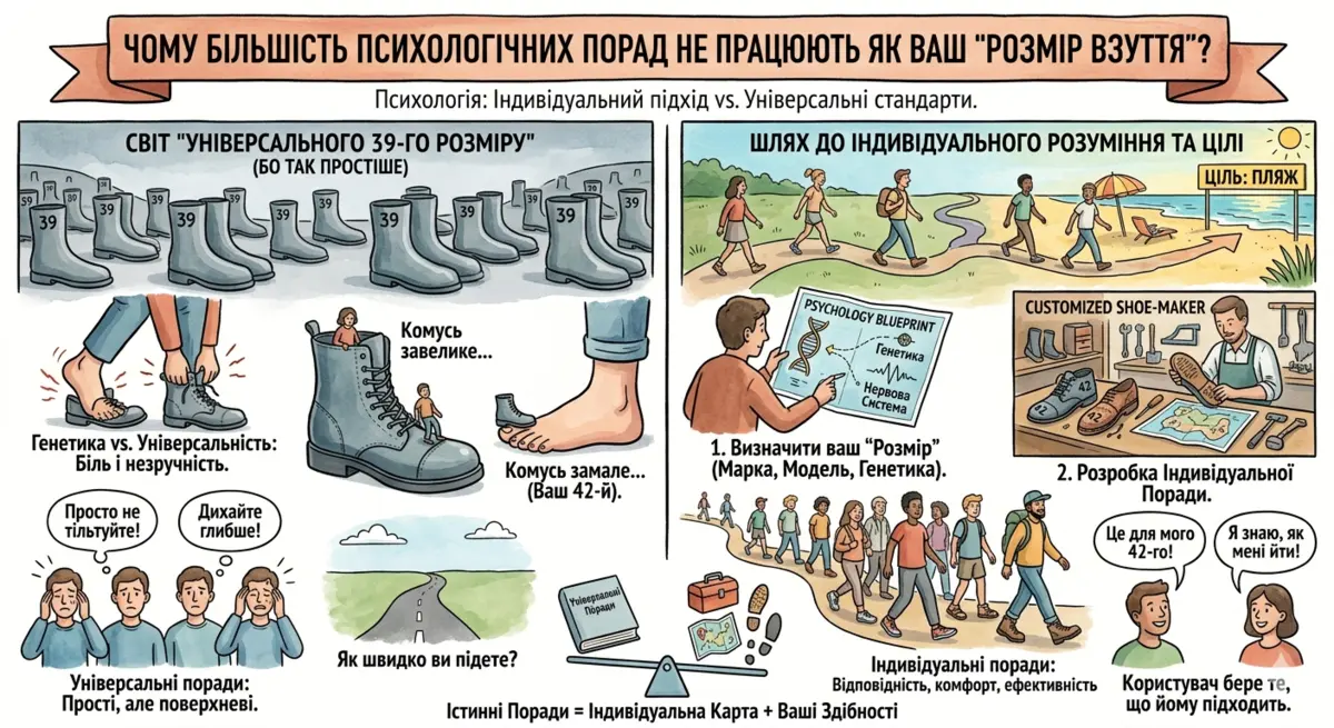 Усі ми розуміємо, що є генетично-індивідуальні особливості, і радити усім носити 39 розмір взуття, ну... комусь підійде, а хтось - це Ви з вашим 42... Чогось більшість статей та порад в сфері психології, саме про 39 розмір чоботів, без урахування вашого розміру та того, що ваша ціль піти на пляж.