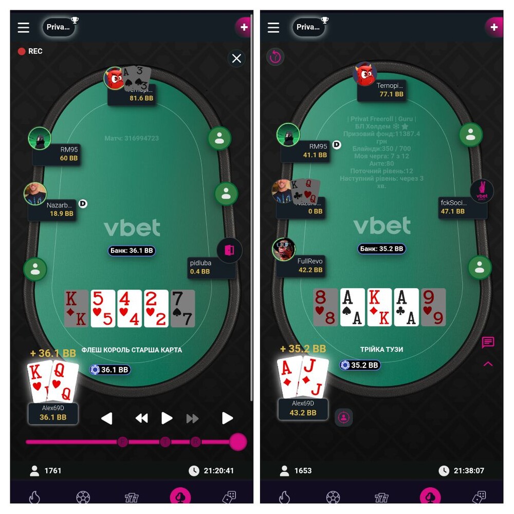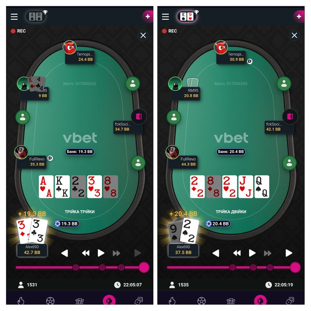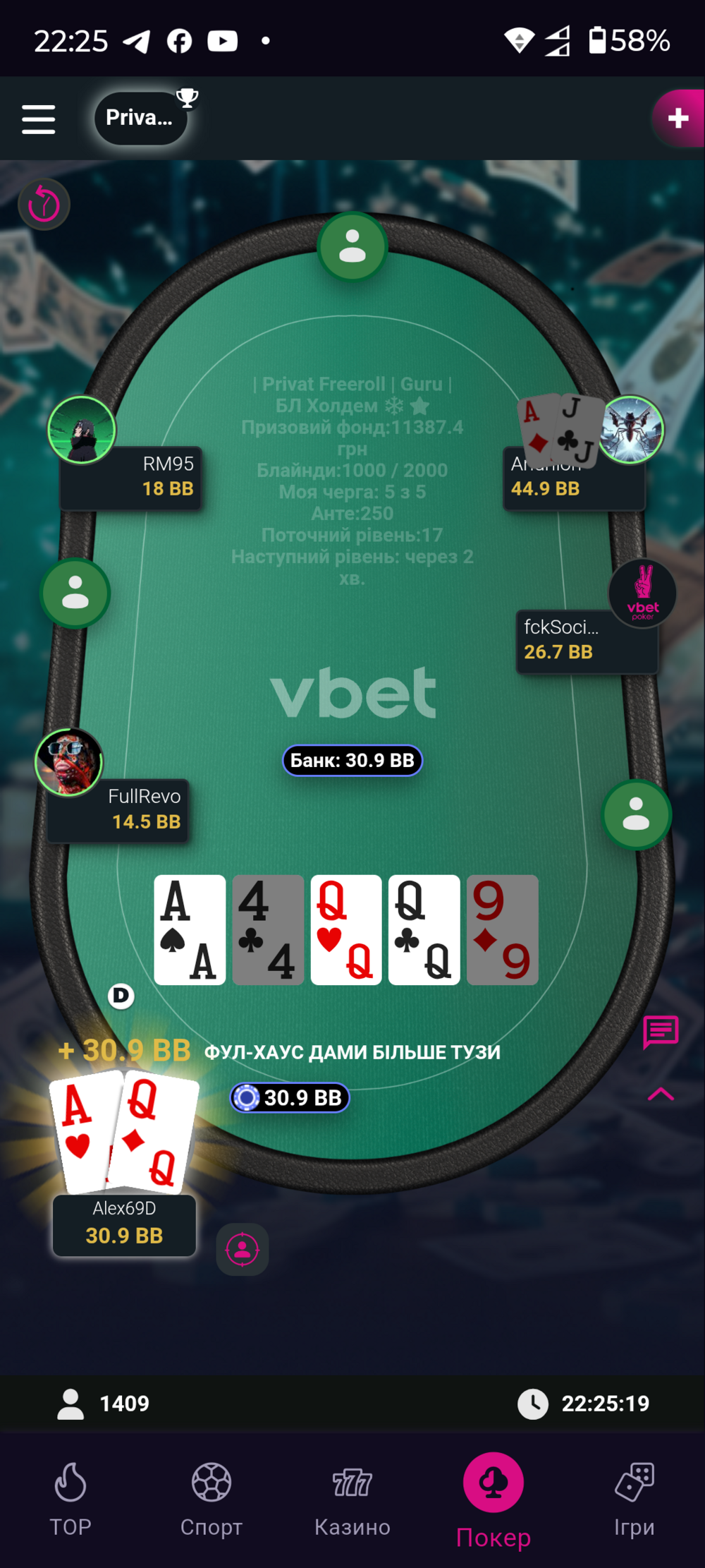 З правого боку від мене три гравці були в сіт ауті, а з лівого боку від мене три гравці досить сильні ніж я, де мені приємно було спостерігати за їх грою.І ось другий час дав змогу трохи покращити стан мого стеку.