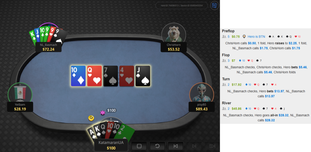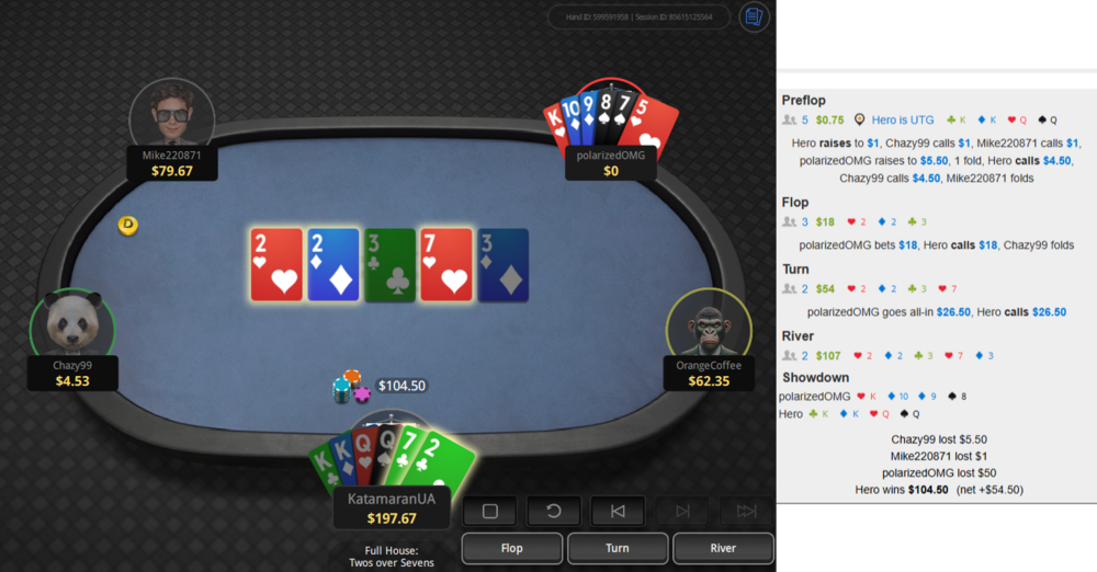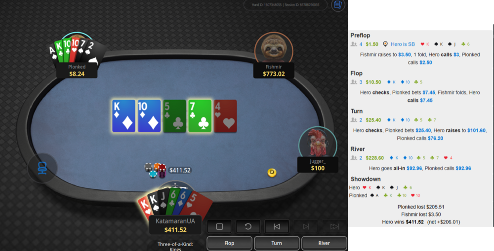 до всього у цій сесії я вже ̶т̶р̶о̶х̶и̶ ̶п̶і̶д̶т̶і̶л̶ь̶т̶о̶в̶у̶в̶а̶в̶ доволі агресивно пихав, а тому блефкетчити мене з дуже підходячою для такого рукою, як у нього, якраз ок (додати сюди його К в руці, що частково блокає наявність топсету в мене).