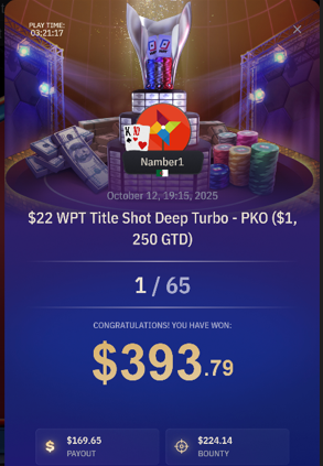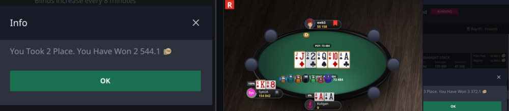 Одже коротко про турнир(22 PKODEEP TURBO 1250gtd) початок був тугенький коли стек став половиною від стартового вирішив полудить, бо інакше фішок не наживешь, запихую флоп на бб по 2й парі на невпевнений сбет, бачу оверпару, рівером бачу стріт і сльози суперника😪пішла роскруточка і посипались ноки, до стадіі 2х столів наколотив 30$ і гарний чіпстек, ну але свідомість відчувала шо зараз шось трапиться і опа маючи натс по флопу опонент ререйзить потім пушить і я вже не чіплідер, з горем пополам досидів до itm, це як раз фінальний стіл (8мах), 7м, думаю хоч 1го пересежу і буде норм, але стекі несильно глибокі пацани грають активно за мене хороший нок і оп оп потроєння з 1010 і тут вже топ 4 і ми 2 самі короткі що були на початку вже чипакі.