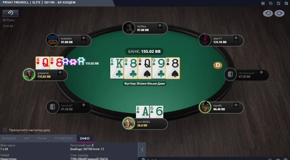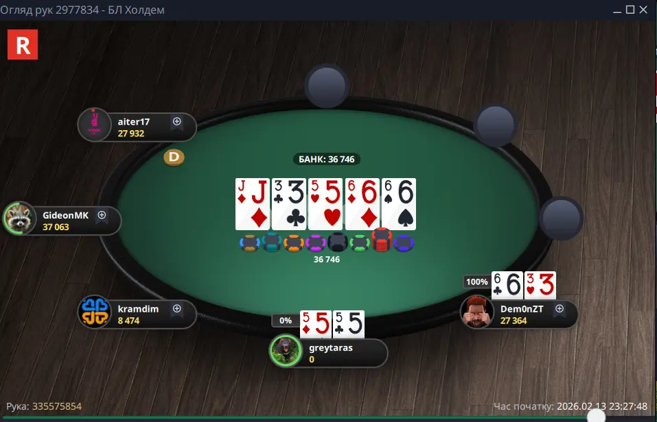 Початок був легко кажучи недуже, бо в перші 15 хв гри я втратив більш ніж 75% свого стеку. Ось в цій роздачі, ох і не думав я що опоненту так гарно доїде рівер