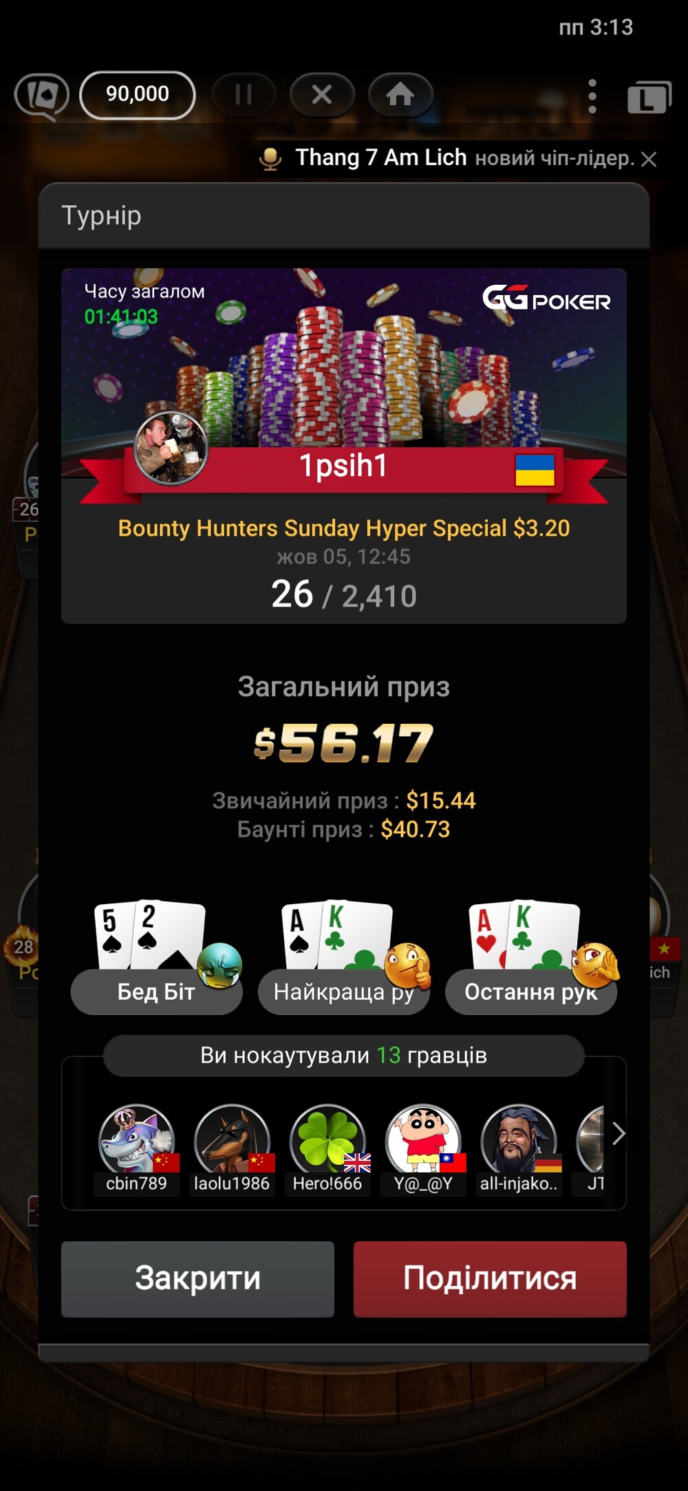 Як завжди зайшов на ггпокер за щоденними нагородами, зіграв Mystery Battle Royale за 0,25 центів, взяв коло 2х дол і зареєструвався в такий самий за 1$, турнір не затягнув але нокнув двох на 3,50$. Після чого зареєструвався в турік який підходив по баліку, це був Bounty hanters Sunday Hyper Special 3,20. В турнірі за фіналку не залетів, але як з нічого результат 26 місце тоже ок, тим більше ноками добре набив