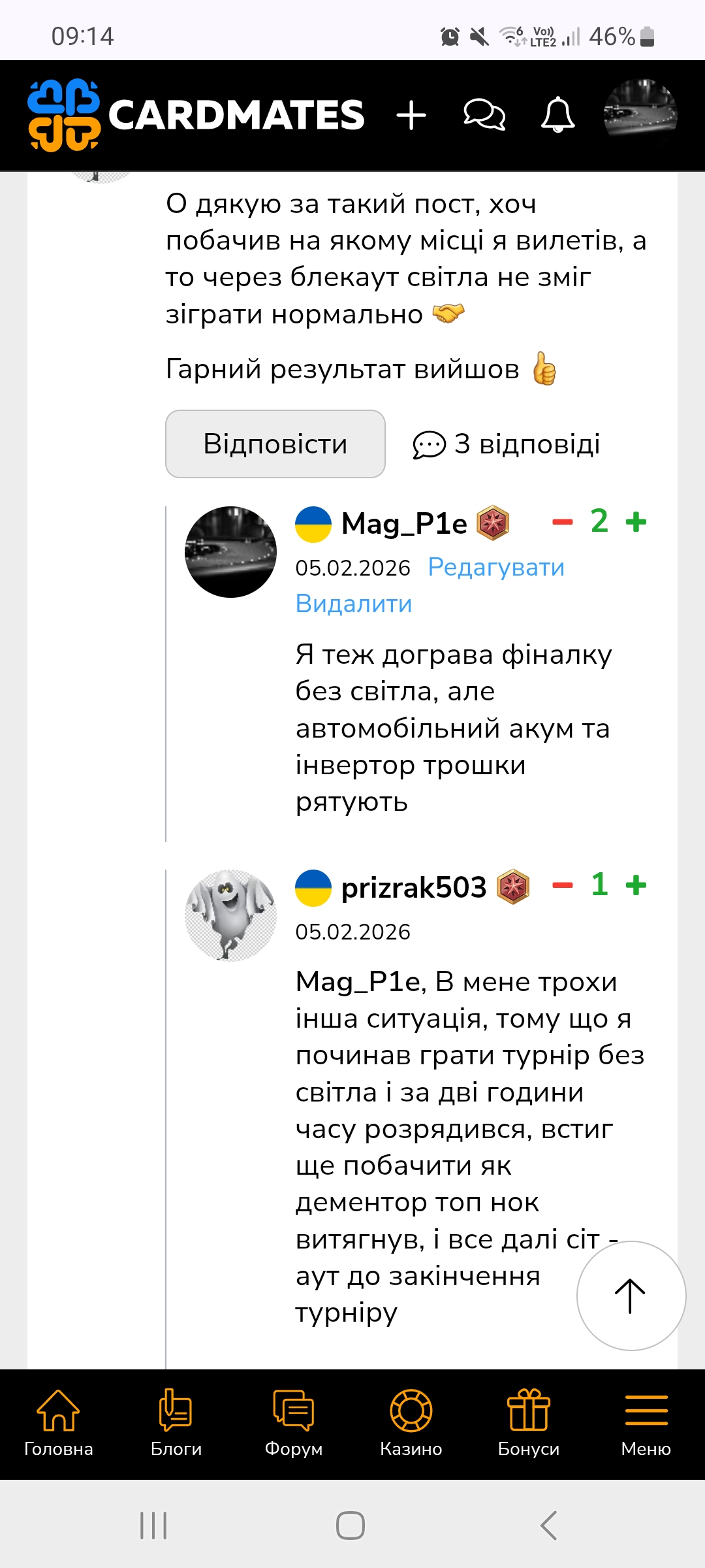 В мене трохи інша ситуація, тому що я починав грати турнір без світла і за дві години часу розрядився, встиг ще побачити як дементор топ нок витягнув, і все далі сіт - аут до закінчення турніру