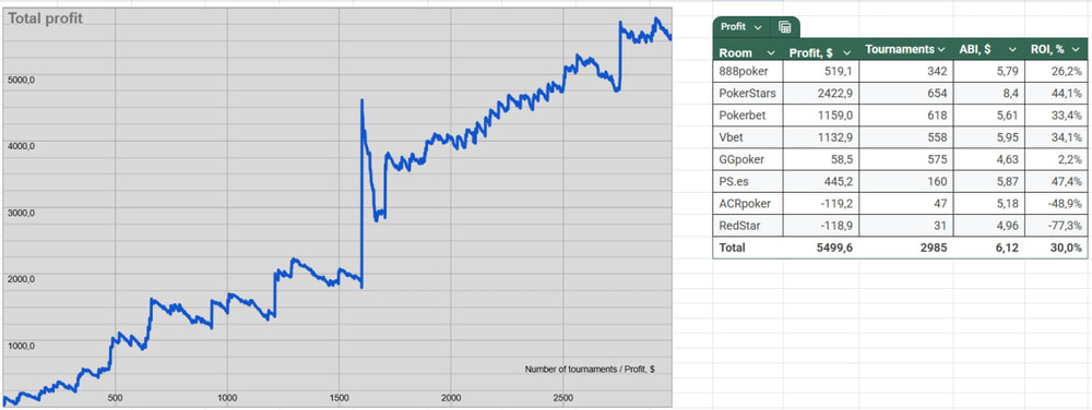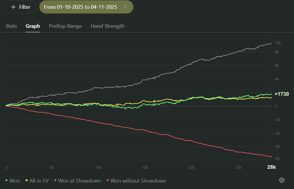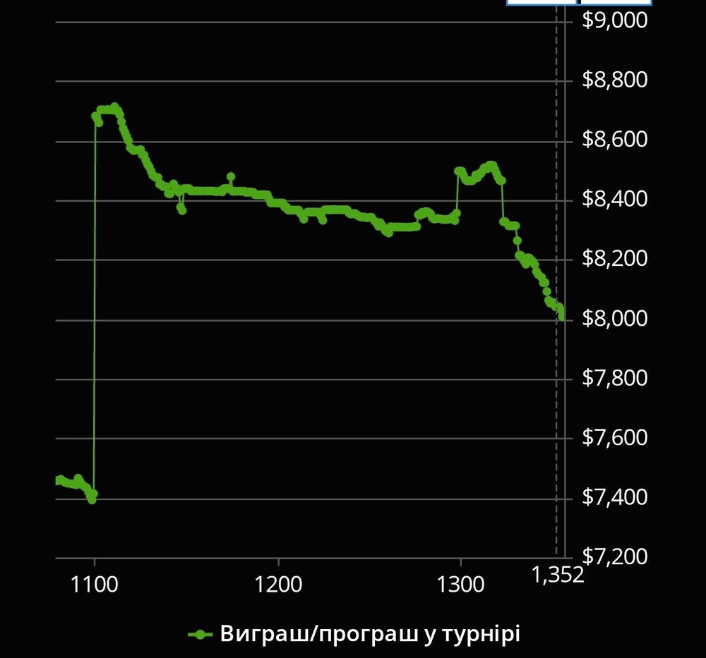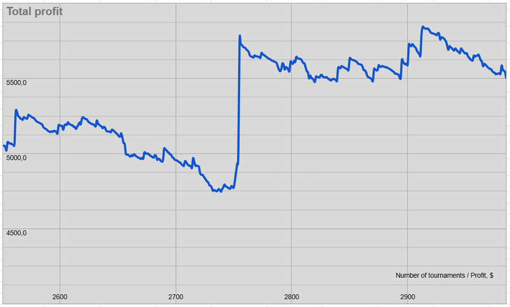 Це той тип тільту, до якого, я думаю, більше схильні як раз "досвідчені бійці", коли тобою керує не бажання відігратися, а бажання "поновити справедливість", бо ну не може ж так прям не заходити. Це не той всім відомий "манкі тільт", коли людина пушить 72о на 50 бб, проте якість рішень суттєво знижується, при цьому кількість турнірів навпаки збільшується, бо "дистанція має повернути". І найнебезпечніше те, що таке складно помітити, для мене це виглядало як звичайні сессії, просто сильно не складалося. На виявлення проблеми пішов тиждень, коли я нарешті зрозумів, що щось не так. В моменті місяць йшов у +750 баксів, але по факту маю такий результат: