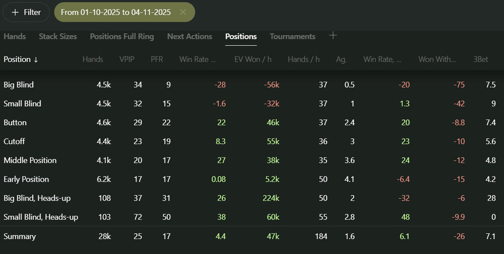 Бачу, ти дуже системно підходиш до цілей (АВІ 20 та 6 evbb/100). Цікаво, ти повністю самостійно працюєш над грою (аналіз, софти) чи, можливо, залучаєш тренера, щоб швидше піднятися і закріпитися на новому ліміті?