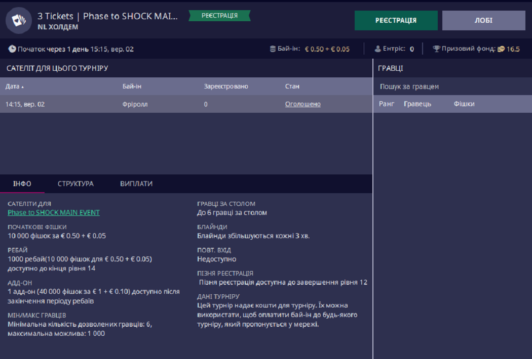 Детальніше із розкладом степ-сателітів, сателітів та фріролів у них ви можете ознайомитись у лобі ігрового клієнту покер-руму. Удачі за столами та впевнених перемог на Shock Series!