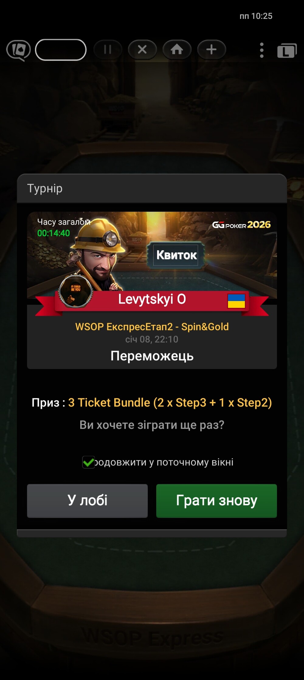 У акції WSOP Express нарешті я побачив щось більше ніж 1 квиток. На колесі випало х5 - 50$. За перше місце - два квитки по 10$ і один 2$.