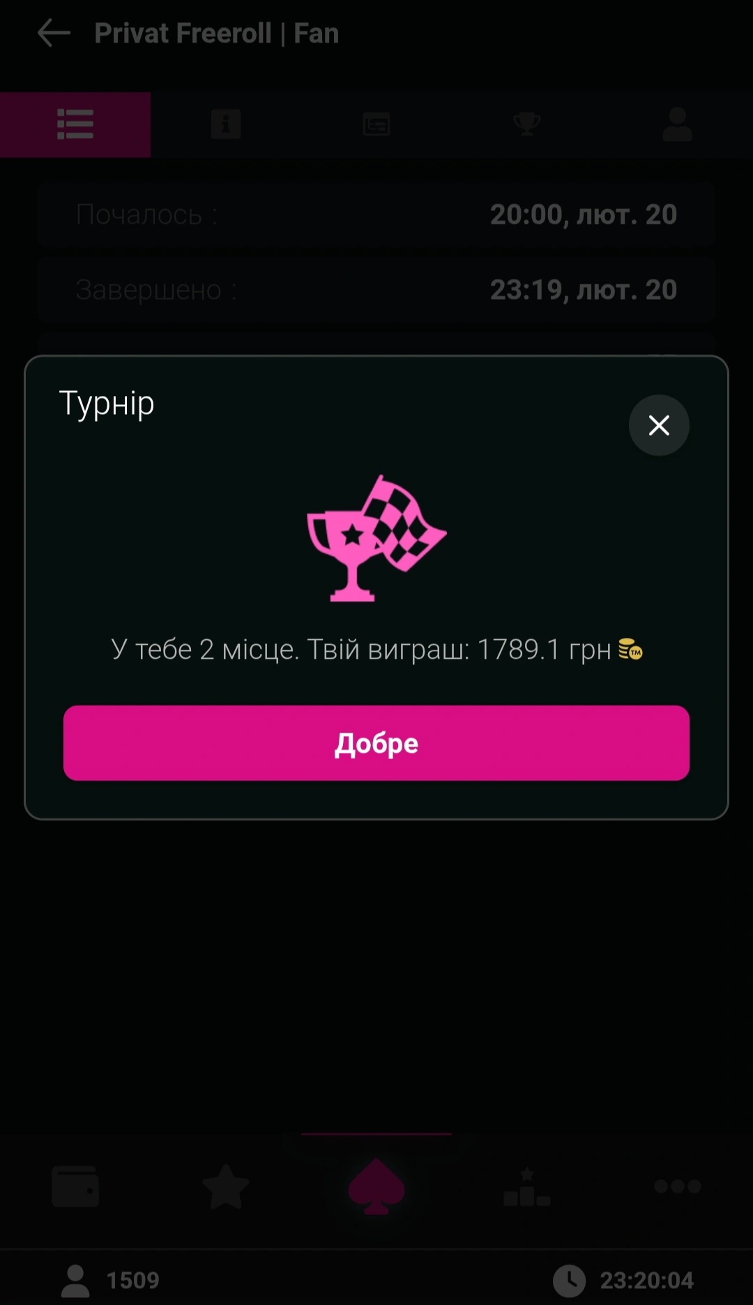 Залишившись 1на1 з опонентом у фінальному столі зробив фатальну помилку (пішов в ол-ін на флопі з двома парами і отримав кол від сету вальтів, терн і рівер вже нічого нажаль не вирішили) тому взяв топ 2 але теж не поганий результат 1700 гривень на подальшу гру. Наступної пятниці буду виправлятися всетаки зочиться для себе перемоги та топ 1 в даному турнірі в копілочку.