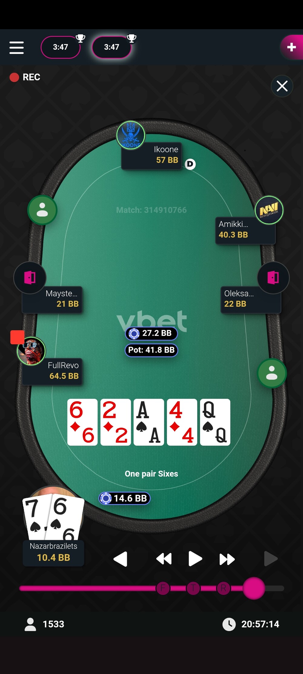З флопу ловимо дві пари, ставимо нас приймають, далі був через рейз ну не зміг викинути та подарив трохи фішок. По тьорну так і подумав що доїхало також дві пари А10. Добре що не на всі фішки, а міг добрати з мене.🙃