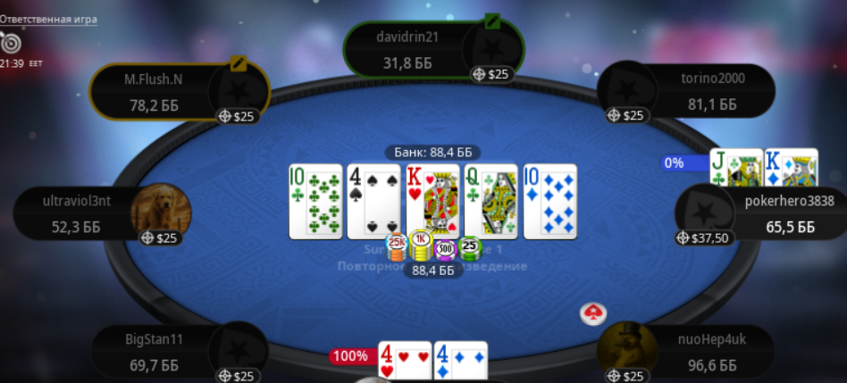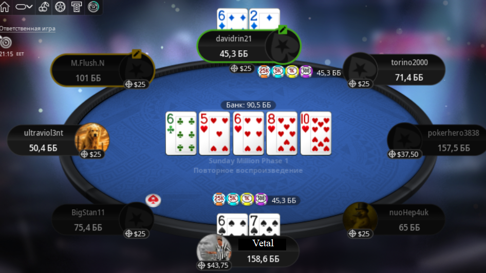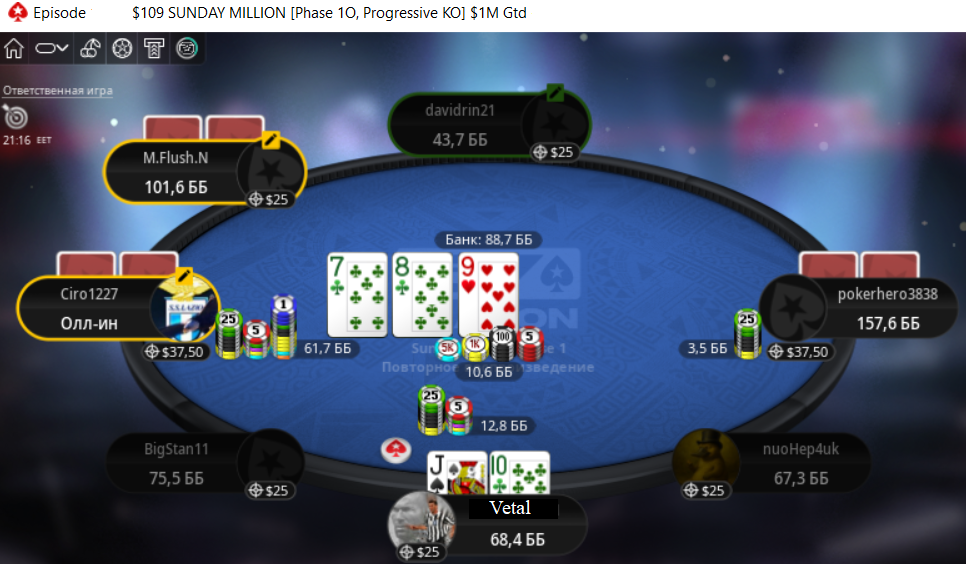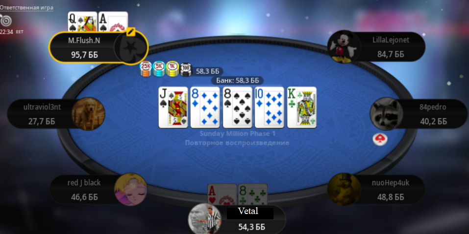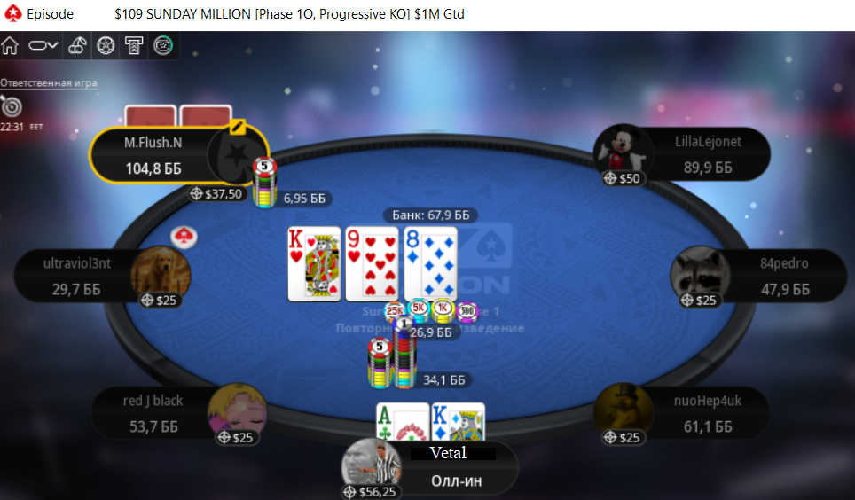 Ледь не зробив помилку, точніше таки зробив, у мультипоті треба було самому бетати, я ж вирішив зіграти чек/рейз та дивився як всі про щось міркують та грають через чек. Добре що спортсмен на катофі не підвів.