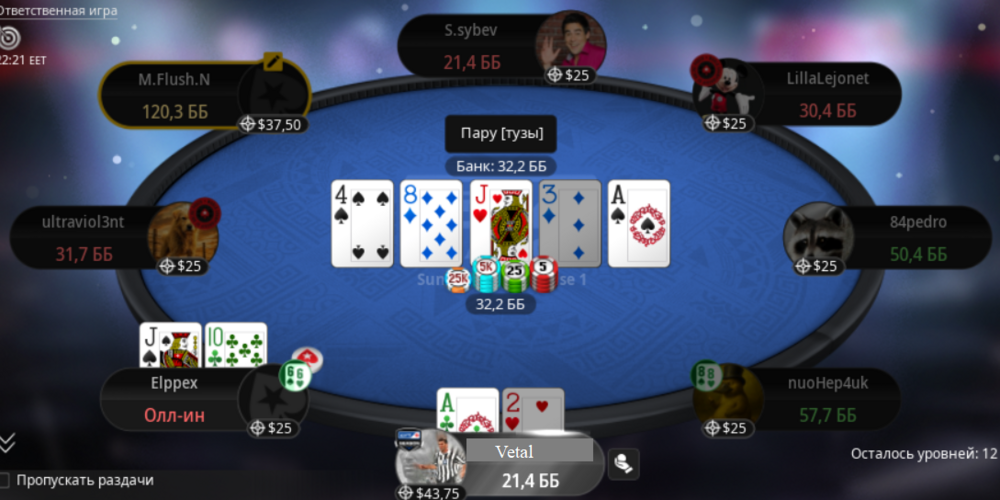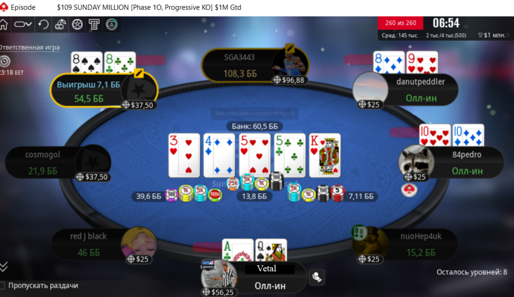 Залишалось 8 рівнів. Можу сказати що я дуже погано грав з великим стеком. Сам не добирав там де мав можливість, при цьому ставки по 10вб на рівері проплачував з топ парою та слабким кікером.