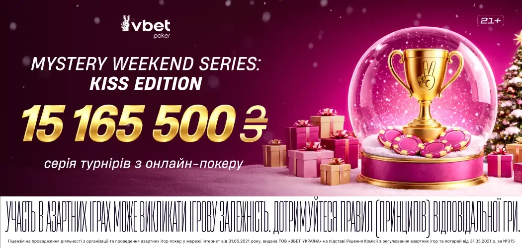Поціновувачі покеру можуть зустріти Різдво та провести Новий Рік за улюбленою грою. З 25 грудня по 26 січня на VBET Poker пройде серія турнірів з онлайн-покеру «Mystery Weekend Series: KISS Edition». У межах цієї серії будуть проходити турніри з Холдему та Омахи з загальним призовим фондом у 15 165 500*.