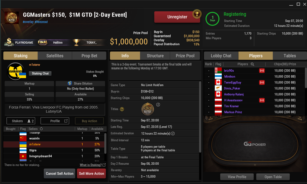 Привіт, друзі! Я готуюся зіграти в одному з найбільших турнірів цього тижня — GGMasters $150 з гарантованим призовим фондом $1,000,000! Це 2-денна подія, формат freezeout (без докупок), що робить гру особливо цікавою та вигідною для тих, хто вміє грати на витримку. Щоб розділити ризик і потенційний успіх, я продаю 27% своєї частки в цьому турнірі. І найголовніше — без націнки! Тобто, ви купуєте частки за їхньою номінальною вартістю. 1% коштує лише $1.50.