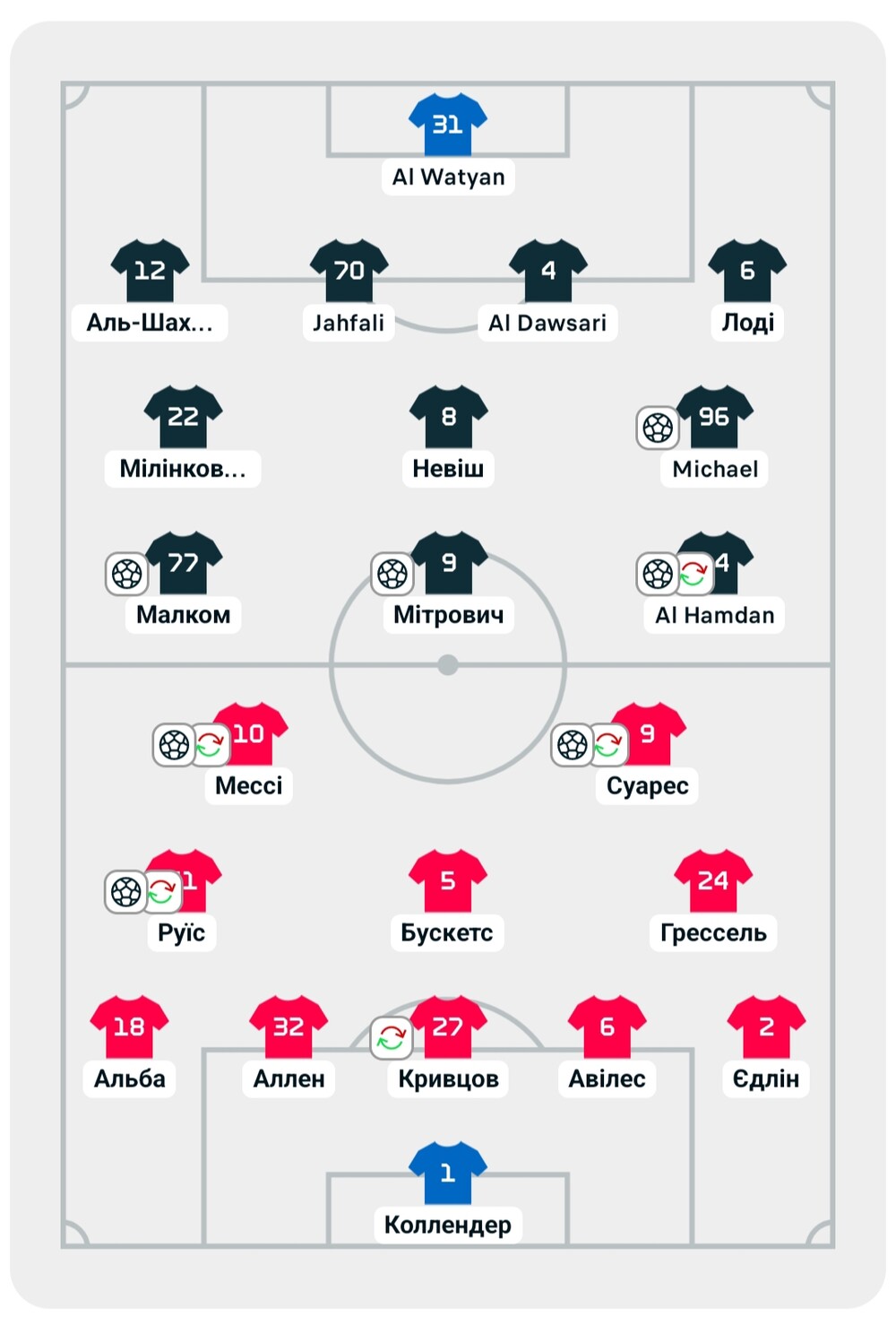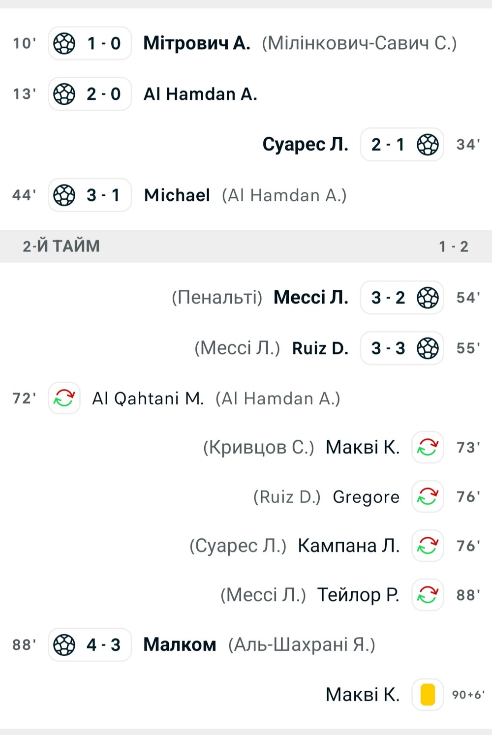 У гостей один із голів забив зірковий Луїс Суарес. Ліонель Мессі відзначився голом з пенальті, а також асистом. У команди з Флориди в основі вийшов український захисник ✊🇺🇦 Сергій Кривцов та провів на полі 73 хвилини, після чого його замінили. В одному з епізодів Кривцов отримав ушкодження та опинився на газоні. Бразилець Малком приніс перемогу саудівській команді на 88-й хвилині після заміни нашого козака ✊🇺🇦😑😐(4:3)