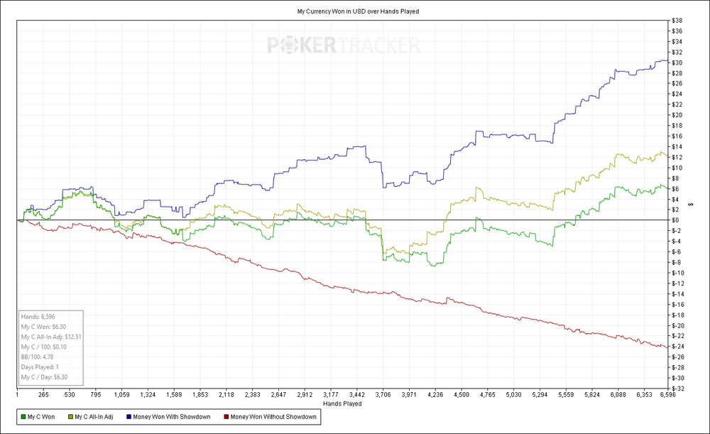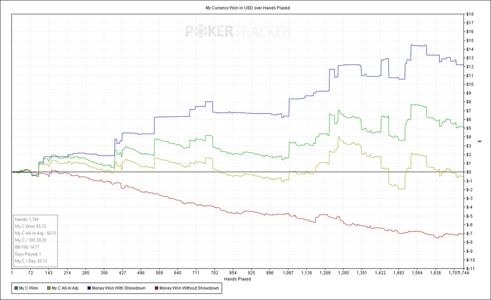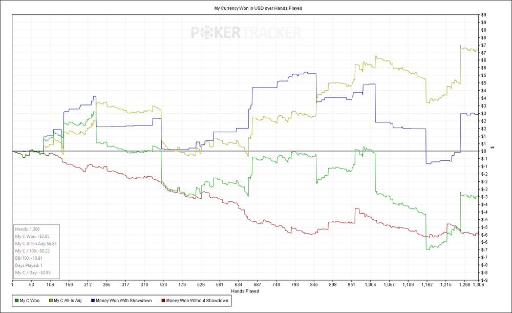 В загальному розумію, що саме хочеш сказати і погоджуюсь, але тут неточність: Жовта характеризує всі виставлення ОКРІМ виставлень на рівері. Бо на рівері вже немає ніякого "очікування" (тому що дошка вже не зміниться і ти маєш або 100% на перемогу, або 0) є тільки фактичний виграш/програш. Математичне очікування з'являється тоді, коли є варіативність, тобто ймовірність виграшу і програшу роздачі. В такому випадку ЕВ = ймовірність виграшу помножене на розмір банку. Якщо ти виставився префлоп АА проти КК в стеках 100 ББ, то жовта покаже +60 ББ, бо ти в 4 випадках візьмеш банк 200 ББ і один раз буде 0 ББ, в середньому 160. Але якщо ви дійшли до рівера і виставились, то жовта покаже лише фактичний результат (+100 або -100) як і синя.
