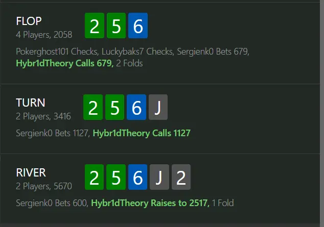 Ну з доїздів тільки якісь двійки (2 комби А2s) або заслоуплеїні сети 55, 66. Це небагато, але для "чутливих" опонентів вистачить. Проте, і я про це окремо написав, звісно я не буду нічого з велью частини так розігрувати, але я не вірю, що рандомний опонент зможе тут відбити по другій парі, випадковому валету, та навіть з двома парами типу 65 складно дуже. І тому роблю висновок - нафіг баланс, експлойт режим на максимум😁. Але в цілому погоджуюсь, такі питання слід собі задавати.